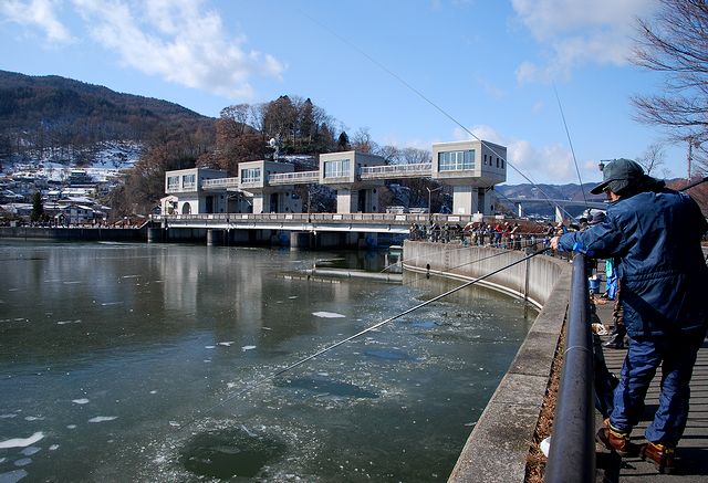 用事で諏訪に行った際、岡谷の釜口水門に行ったら大勢のワカサギ釣り人で賑わっていた。