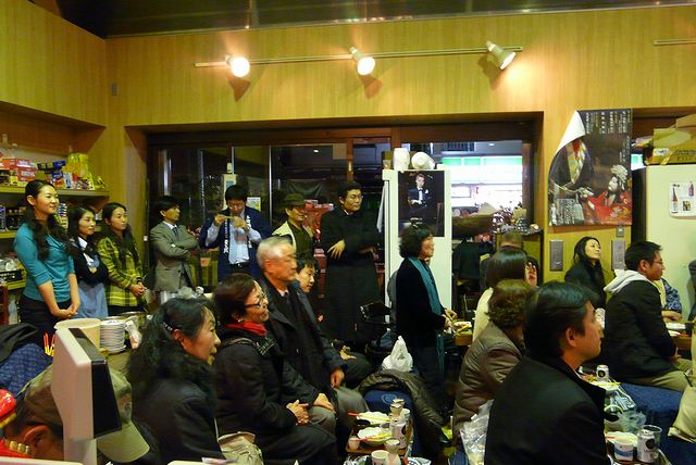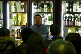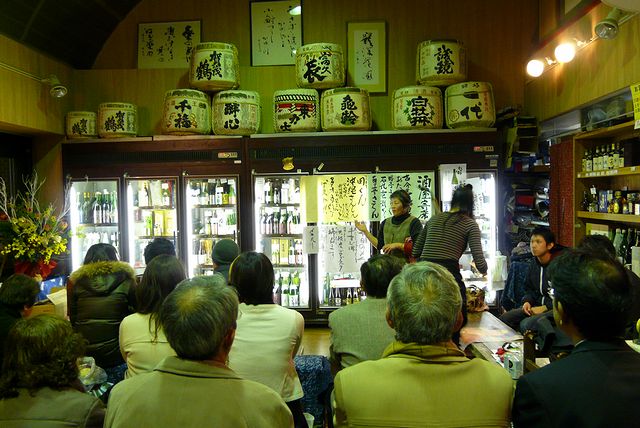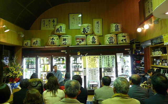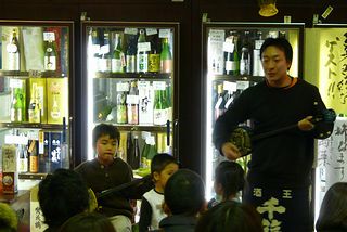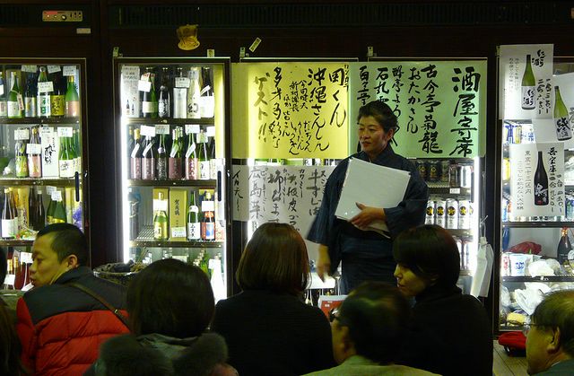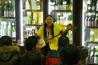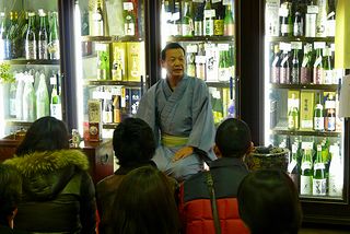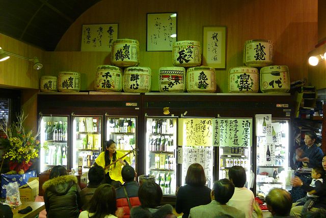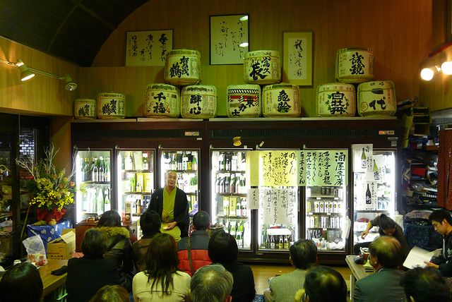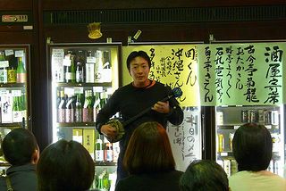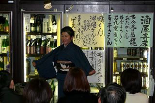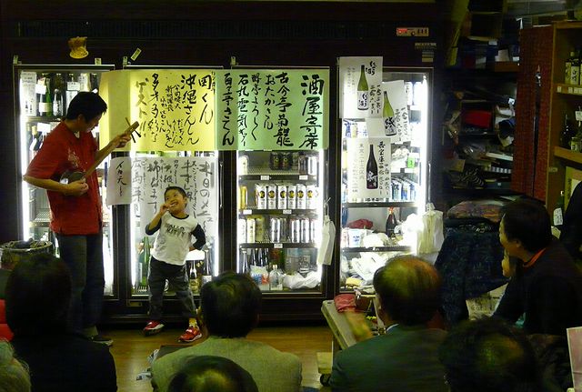 酒屋さん「今田商店」の中は普段は商品でいっぱいなのに片付けられて「酒屋寄席」の会場と様変わり。