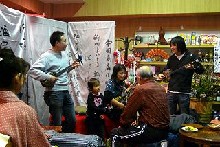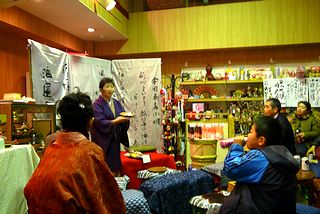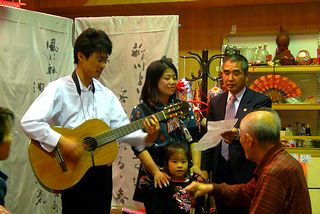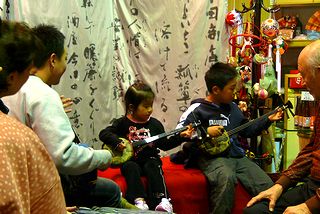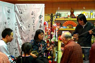 この酒屋で酒屋の若旦那が週2回開いている沖縄「三線」教室の生徒(子供、大人)が演奏
