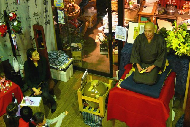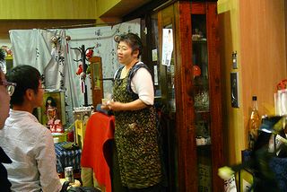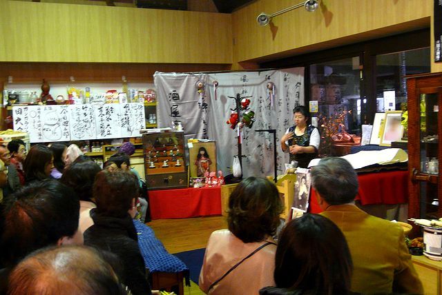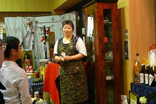 | 酒屋さん「今田商店」の中は普段は商品でいっぱいなのに片付けられて「酒屋寄席」の会場と様変わり。 今回もまた今迄に無い配置で。 女将さんの挨拶で始まり始まり。 | |