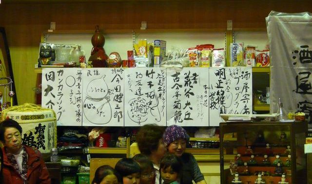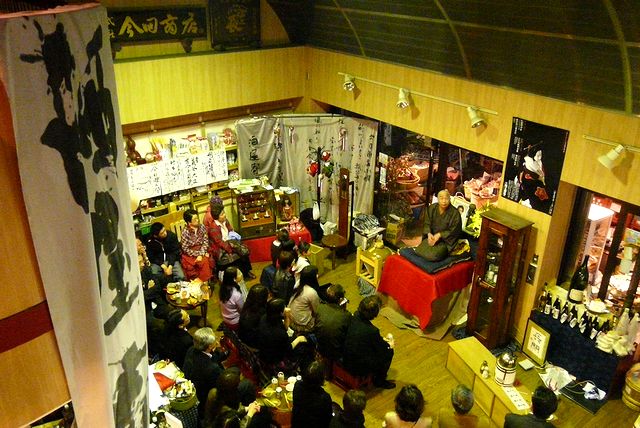 菊龍師匠の落語。 先程荒谷大丘氏が書かれた「酒屋寄席」の垂れ幕が2階から垂れている