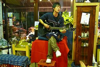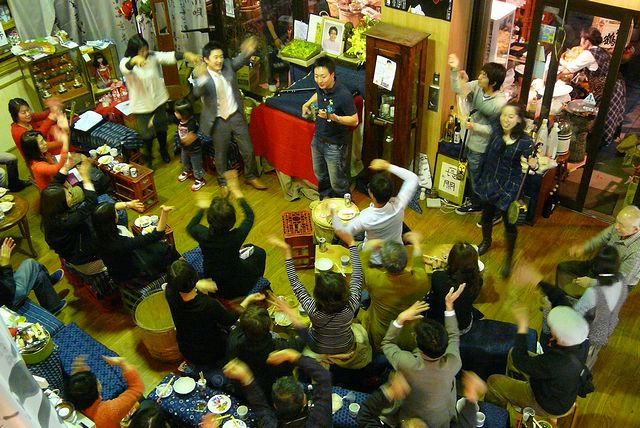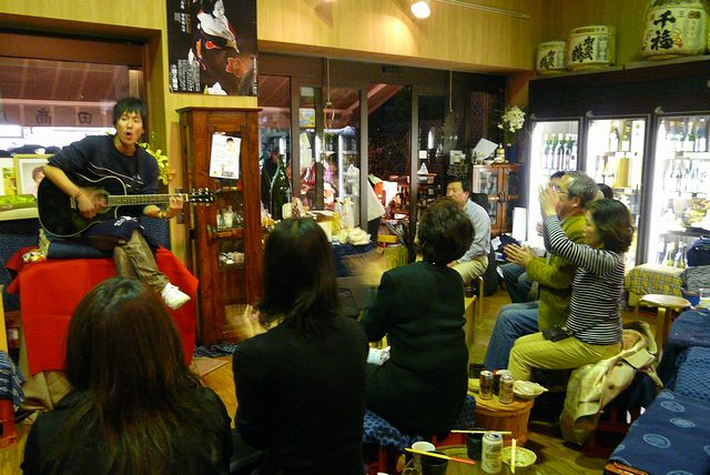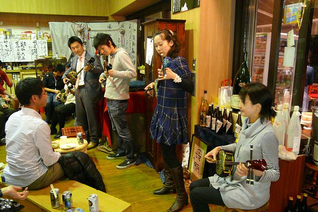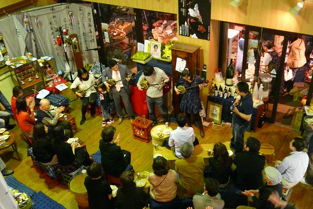 | 酒屋の若旦那の沖縄三線教室の生徒さん達の演奏。 4/2に認定試験を控えている | |