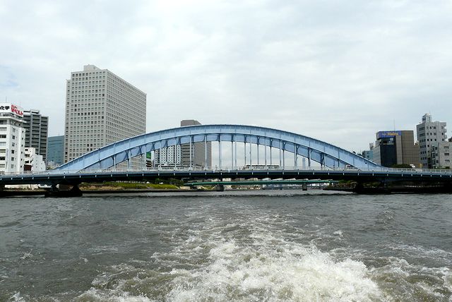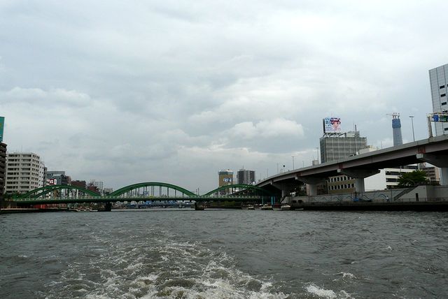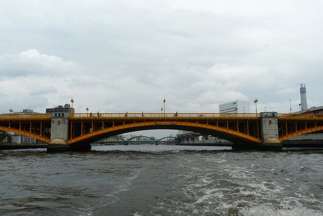 「蔵前橋」をくぐって。 向こうは「厩橋」 右にスカイツリー