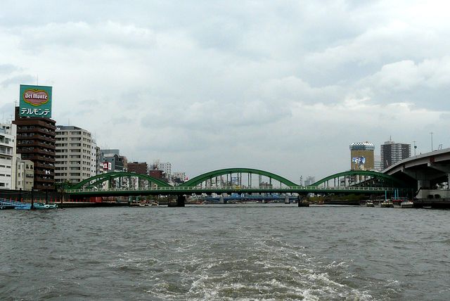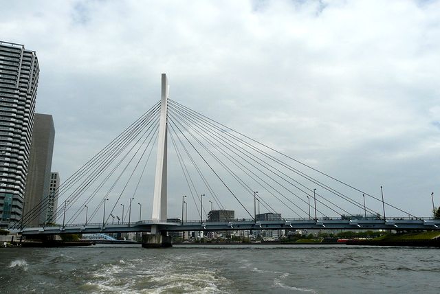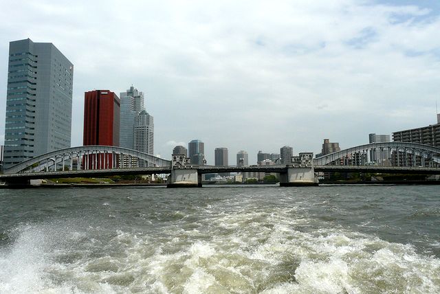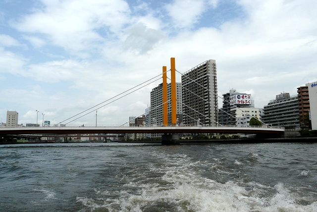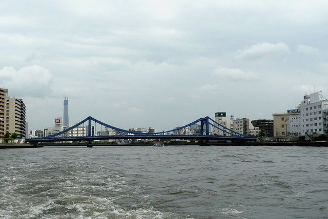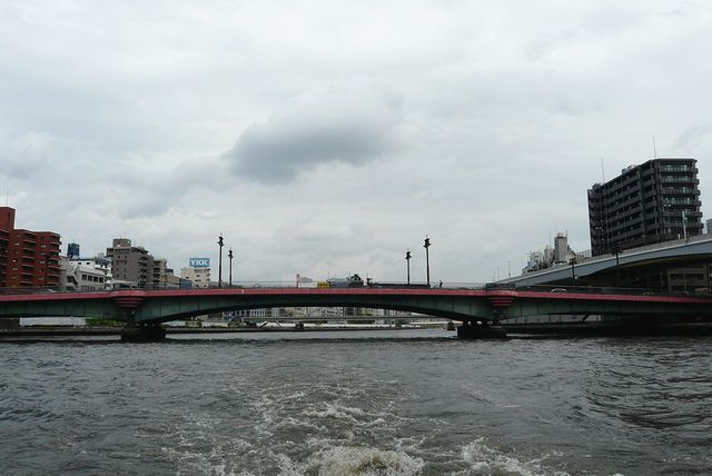 佃大橋。 新川大橋の向こうに微かにスカイツリーが見える。 これを最後に水上バスからは見えなくなった。