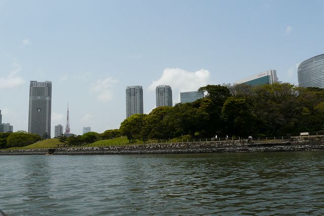 途中の停船場の「浜離宮」。 左に東京タワーが見える