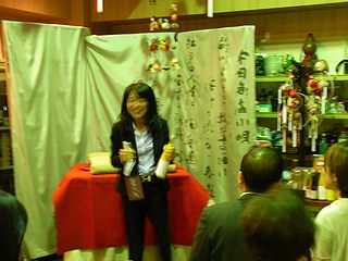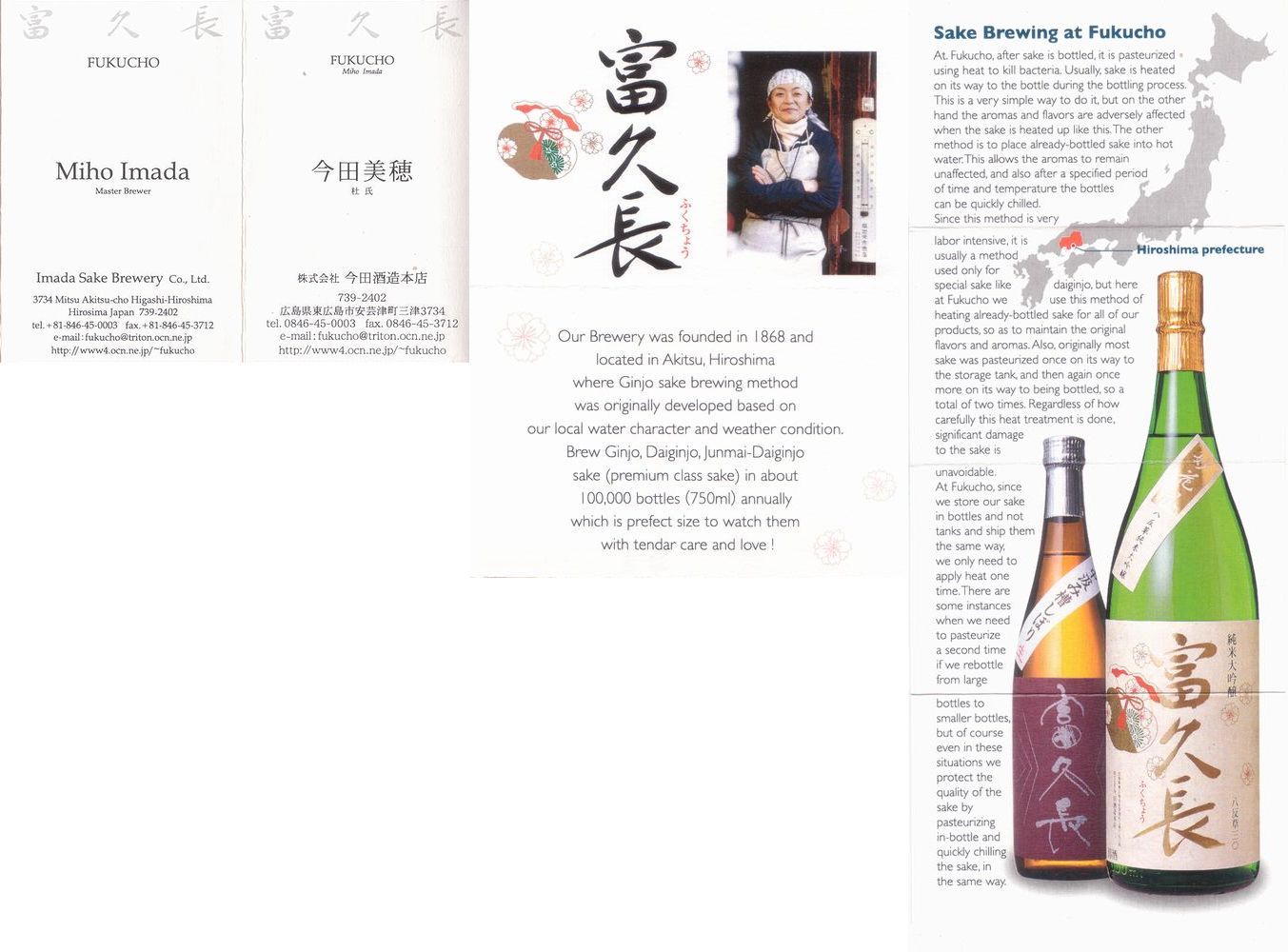 ここで広島の銘酒「富久長」の女性杜氏の今田美穂さんがお酒の説明と皆に試飲を。 私はこの酒屋さんではこの「富久長」が一番好きでお使い物や飲み会の持参によく買ってます。 このお酒はJALの国際線に出される日本酒に選らばれています。 名刺を戴いたらこんな風に(クリック)なっていた。 | |