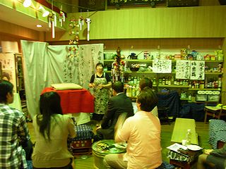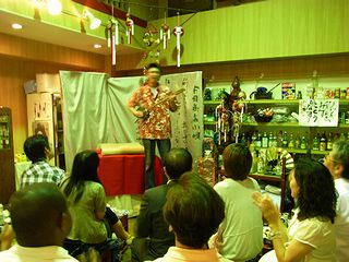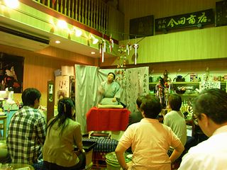 | 酒屋さん「今田商店」の中は普段は商品でいっぱいなのに片付けられて「酒屋寄席」の会場と様変わり。 女将さんの挨拶で始まり始まり。 | |