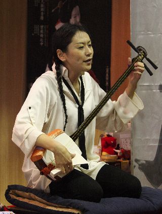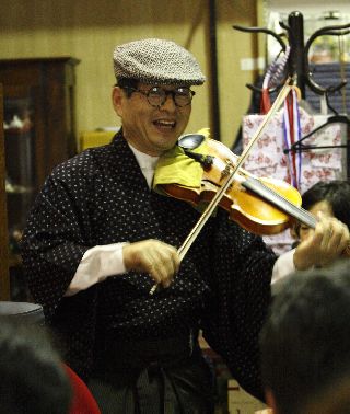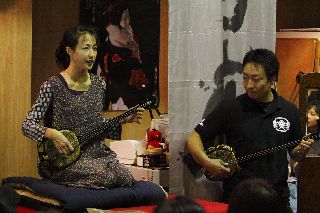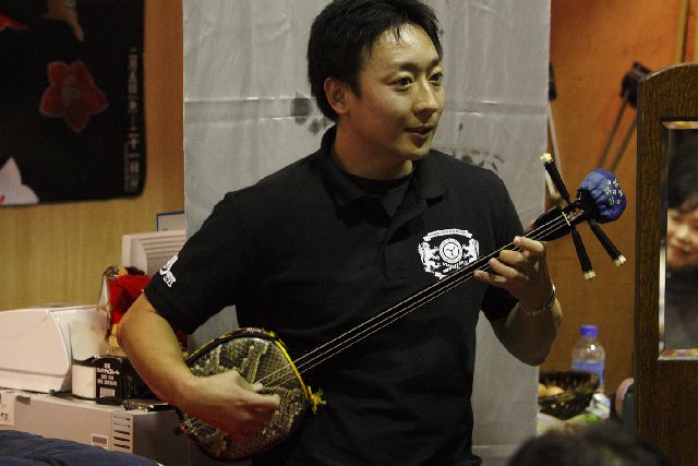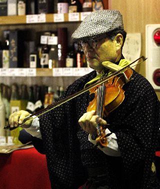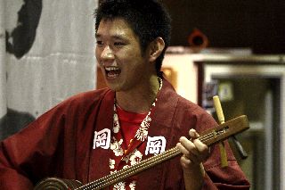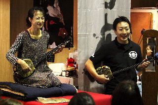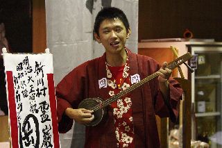 | 酒屋の若旦那の沖縄三線で歌と演奏。 毎週2回(大人向け、子供向け)酒屋で三線教室を開いておられる。 | |