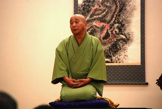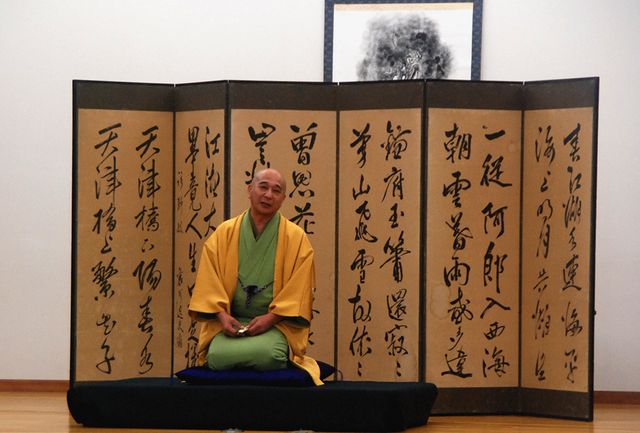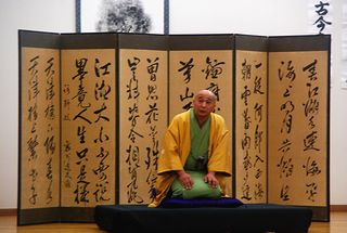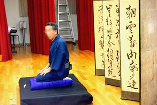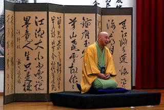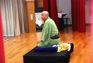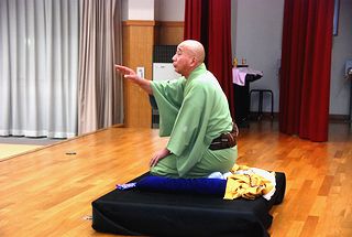 | 古今亭菊龍師匠の一席目の落語「生徒の作文」。バックは主催者の金沢氏所蔵の屏風 | |