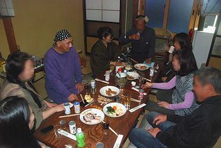 着いて早速温泉に浸かって、一番広い部屋に全員集合して宴会の始まり。 15:30頃 | |