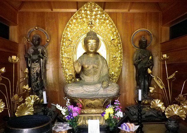 国重要文化財・阿弥陀如来像。 左:地蔵菩薩像、右:聖観音菩薩像(双方とも長野県宝) | |