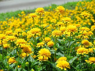 | この花は「ヒメヒマワリ」。 小河内地区の皆さんが育成している。 霞んでいる山は中央アルプス