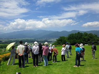 | 学芸員より説明を受ける研修生。 伊那市方面、中央アルプスが一望できる。 | |