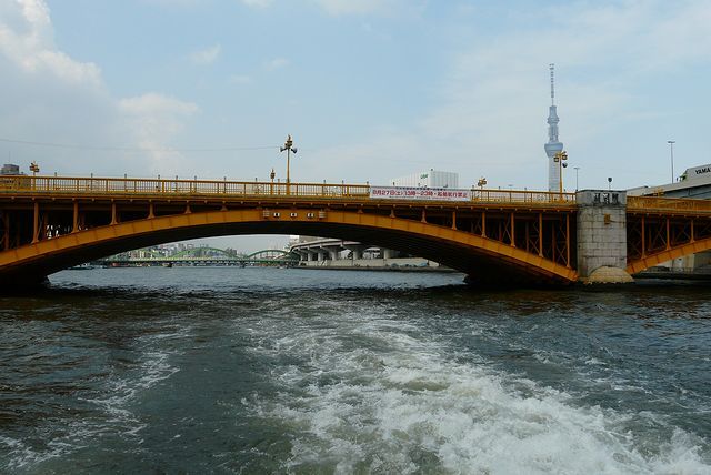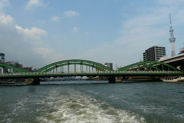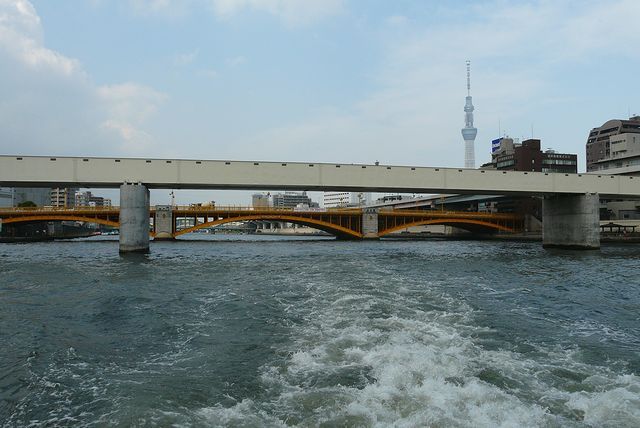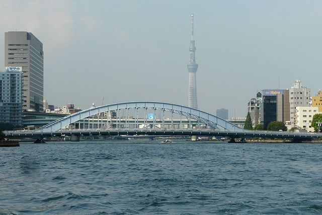 | 工事中の両国橋(向こうは蔵前橋)とスカイツリー | |