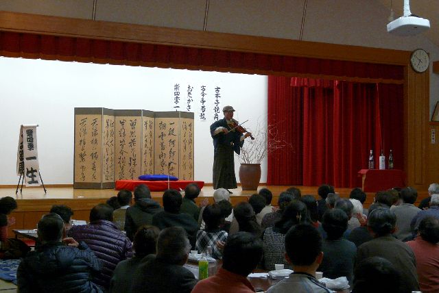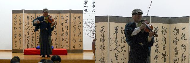 | 三番目:楽四季一生さんの大正時代の「バイオリン演歌」演奏と唄。 「鉄道唱歌」から始まり、「のんき節」、 「ゴンドラの唄」、「まっくろ節」、「金色夜叉の唄」、「船頭小唄」など面白い語りで次々と演奏と唄。 | |