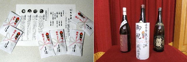 私が用意した「いるみ寄席」の案内と皆さんに配る飴入りの祝儀袋(今田酒屋の女将さんに「名前の披露で そのくらいのことはするもんだ」とプレッシャー掛けられて・・・)。 右は酒屋の女将さんと MI さんからのお祝いのお酒 | |