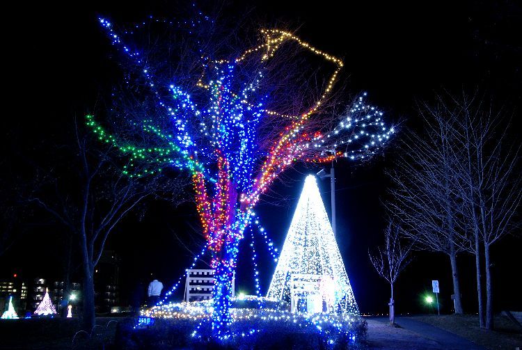 諏訪湖畔をイルミネーションで飾る「諏訪を彩る光の祭典」が始まった。湖上には御柱のイメージの柱と