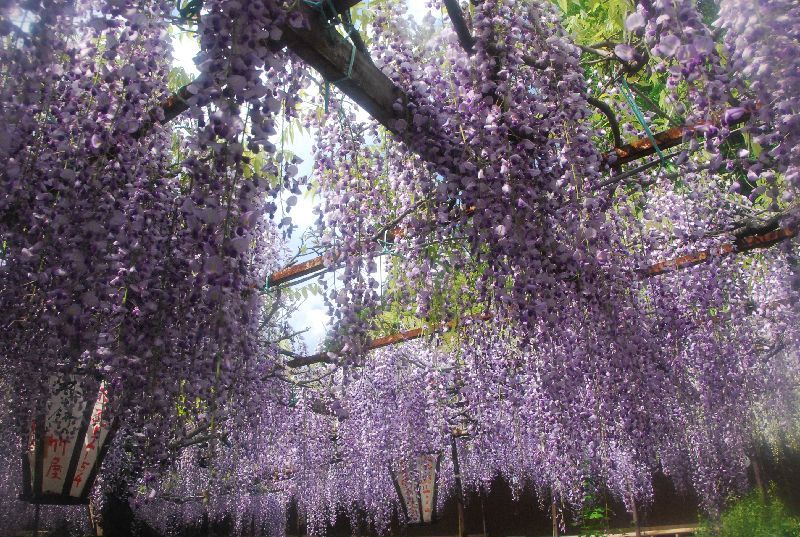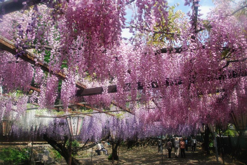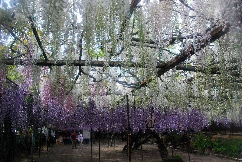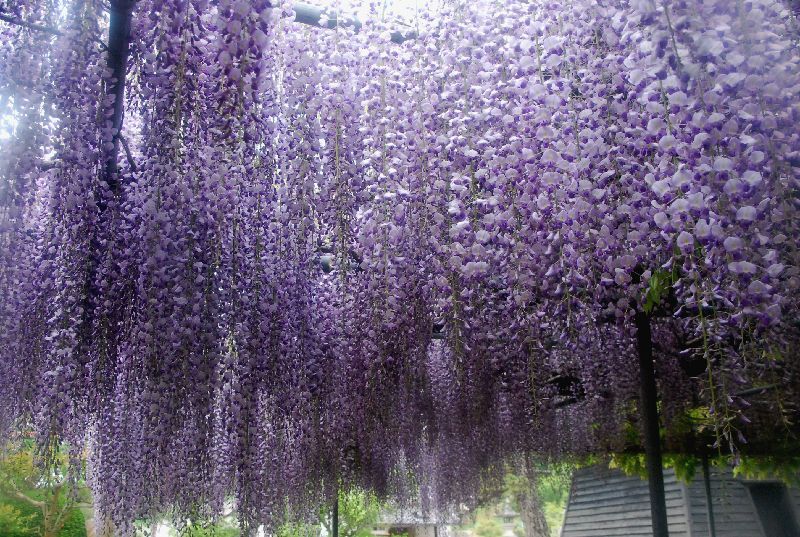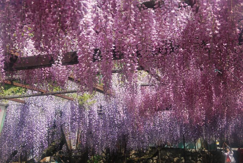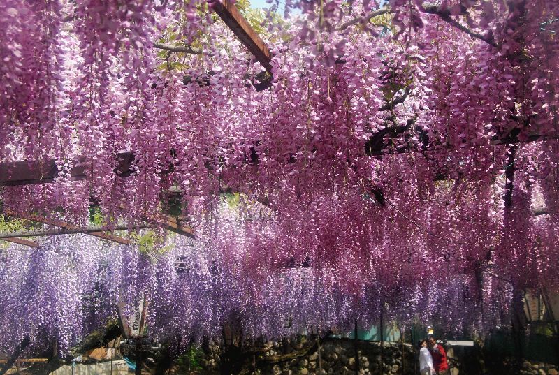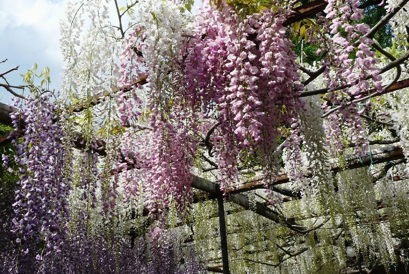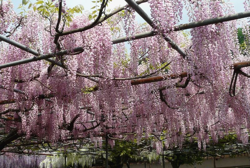 花の房が1m程になるにはもう2,3日後。どちらも紫、桃色、白の藤の花が楽しめる。