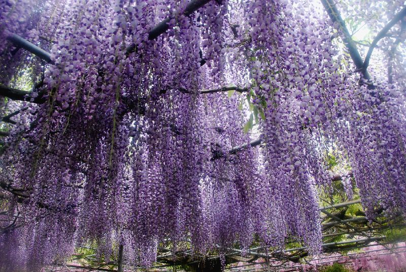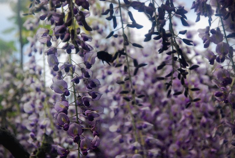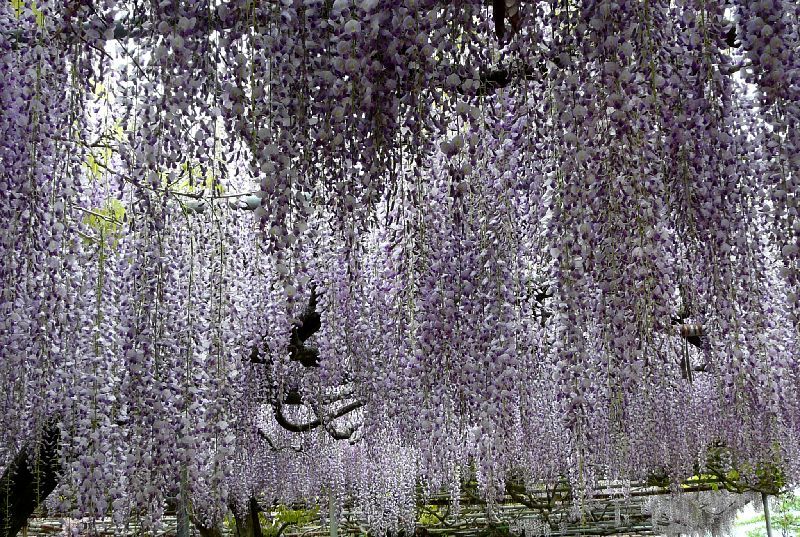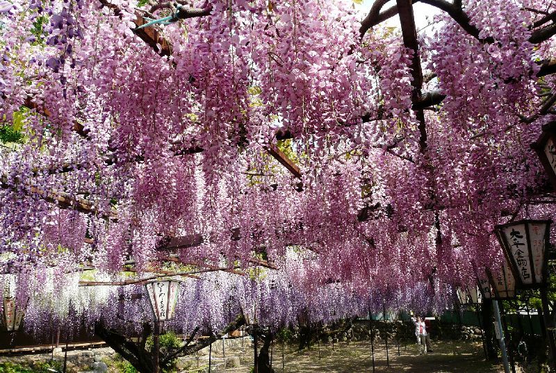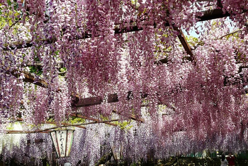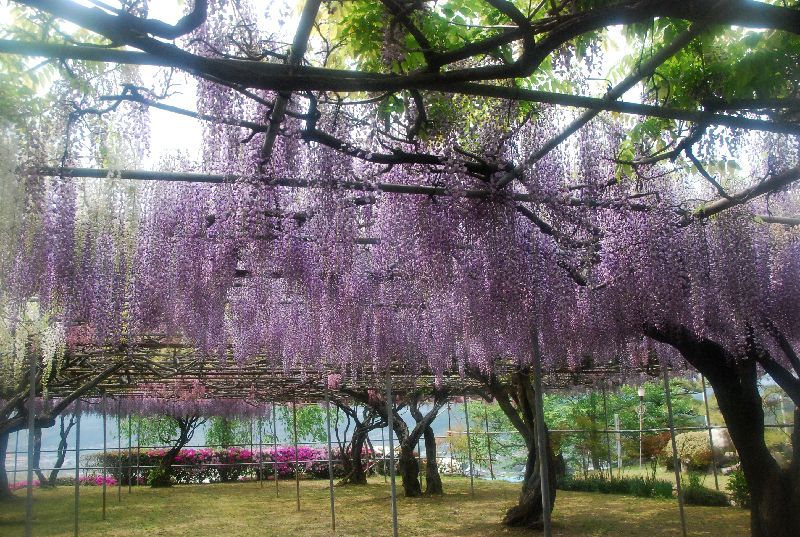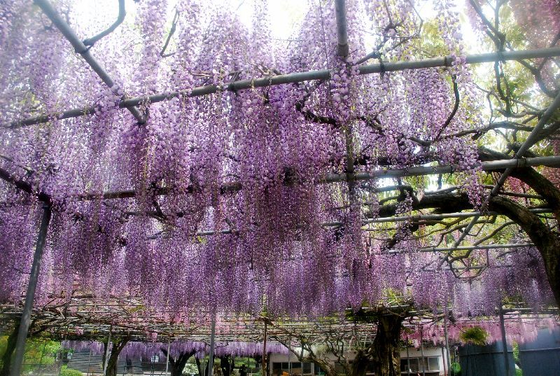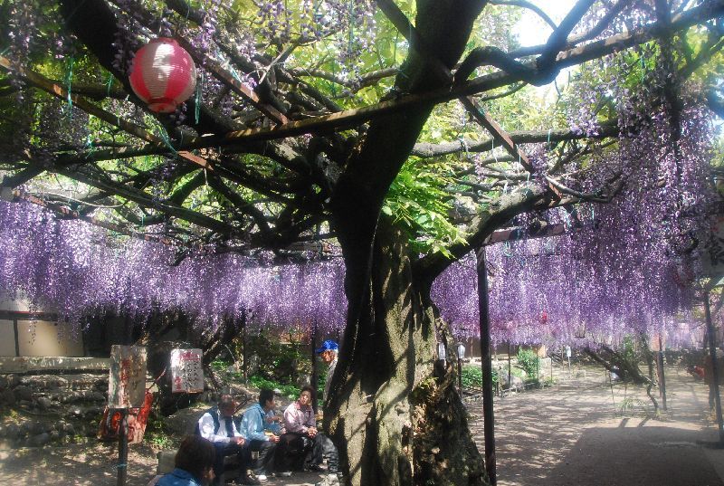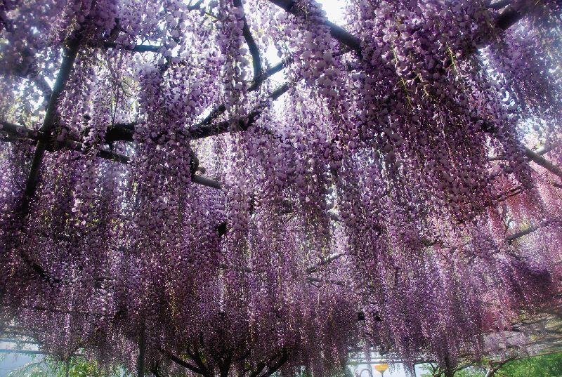 花の房が1m程になるにはもう2,3日後。どちらも紫、桃色、白の藤の花が楽しめる。