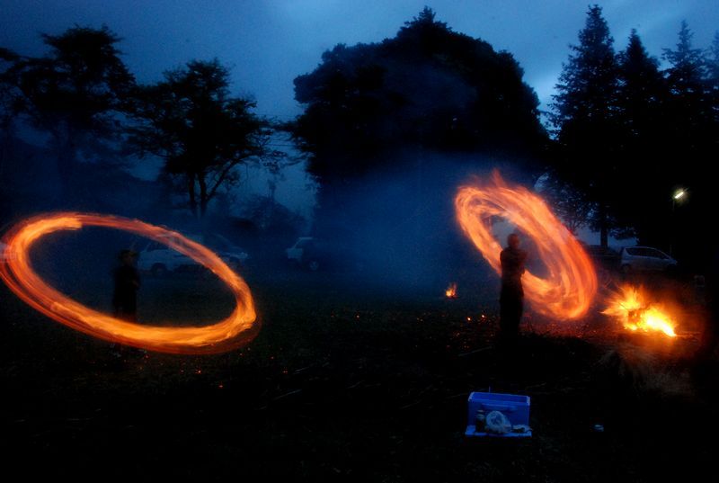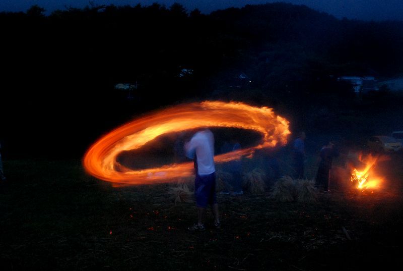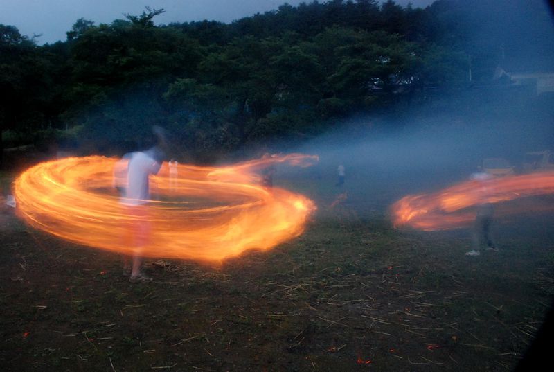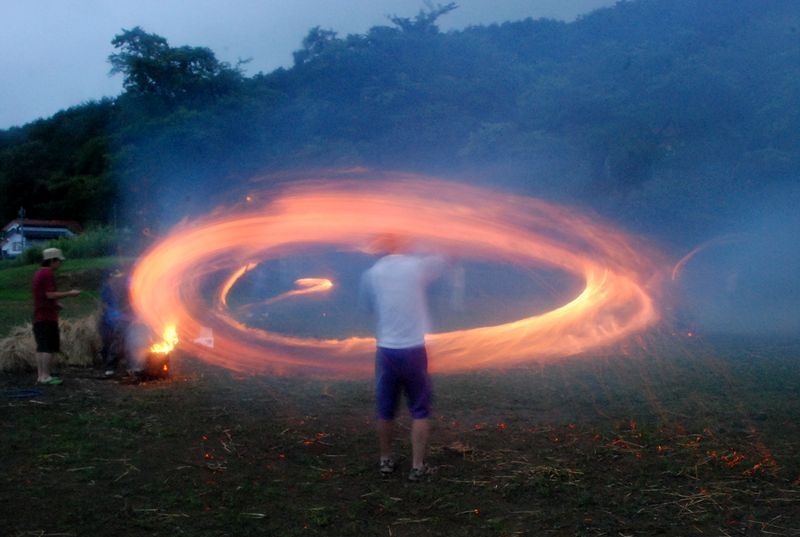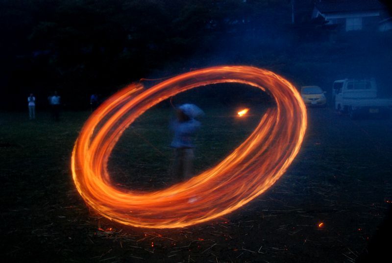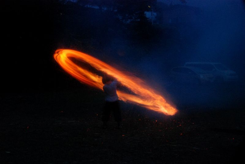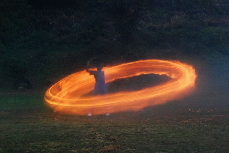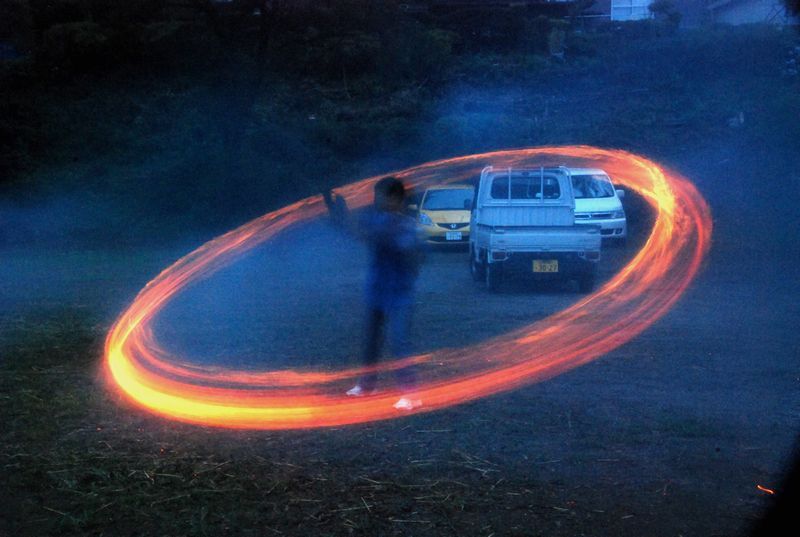 火を付けて振り回す。子供の行事で今はまだ明るい18時に点火するので簡単に火の軌跡が撮れない。2秒程開放して撮影。