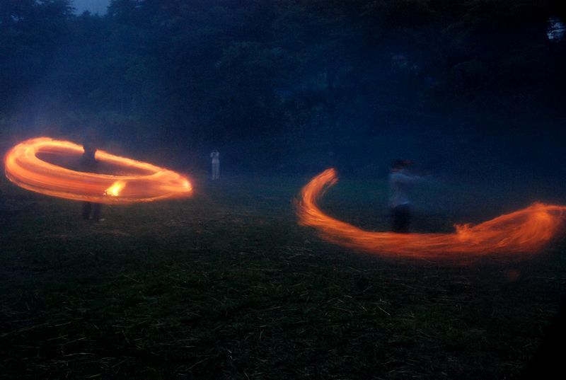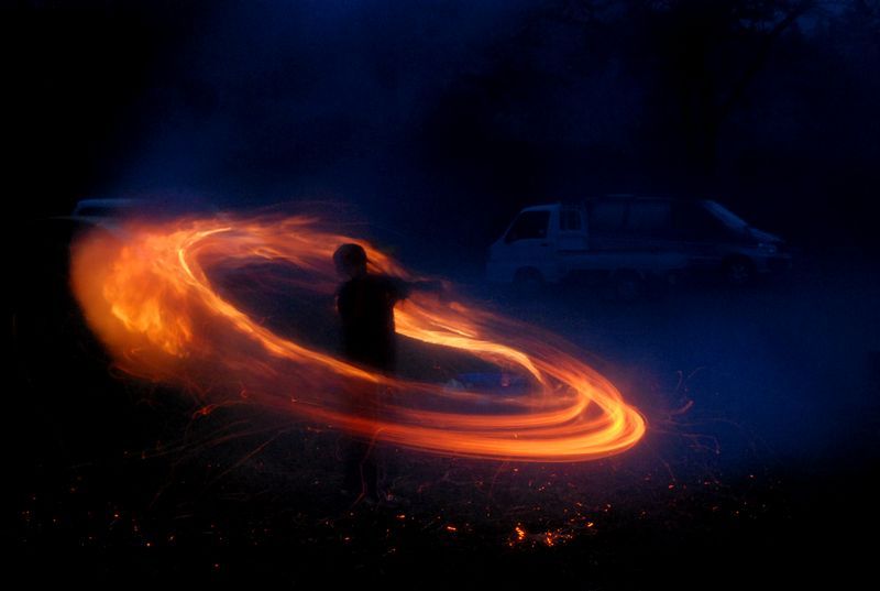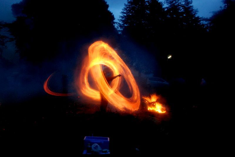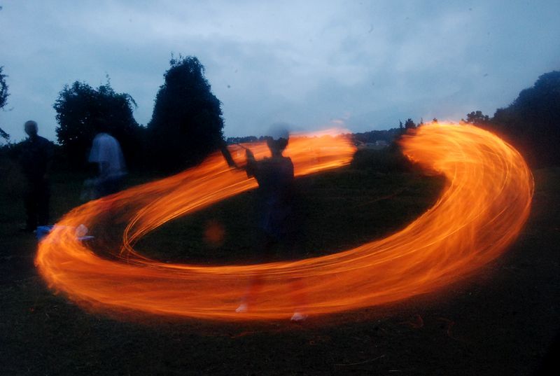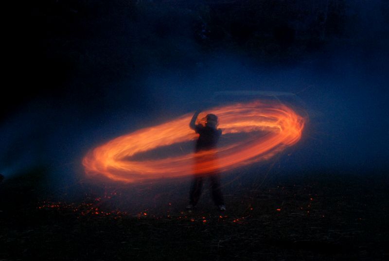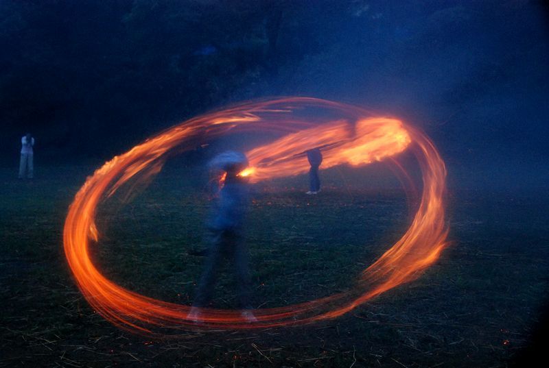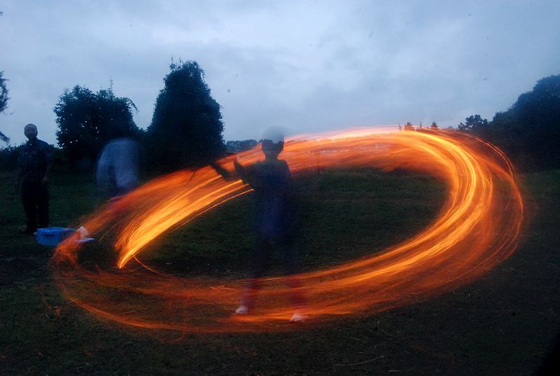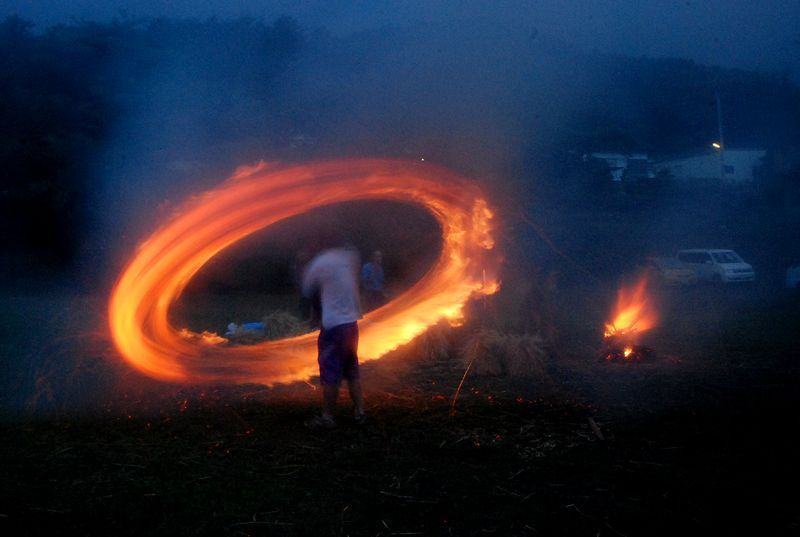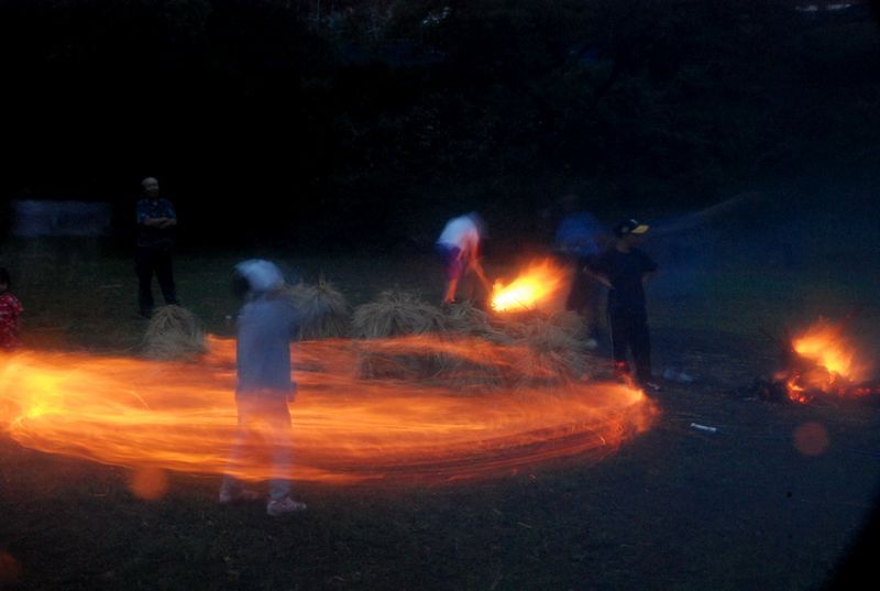 火を付けて振り回す。子供の行事で今はまだ明るい18時に点火するので簡単に火の軌跡が撮れない。2秒程開放して撮影。