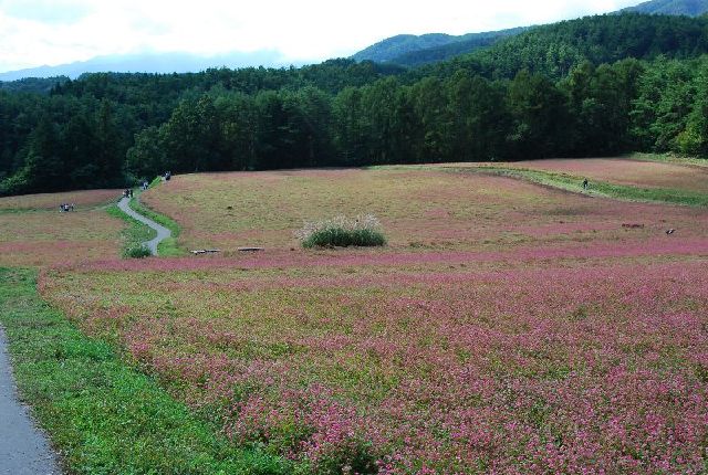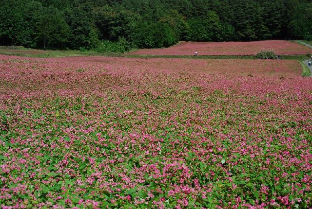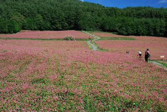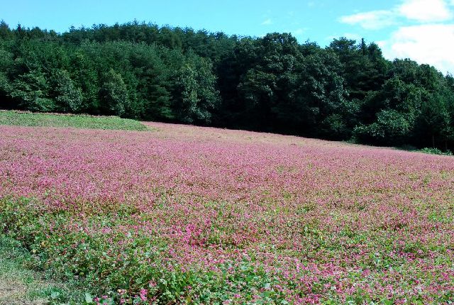 台風17号のは30mmの雨と風速10mほどの風で済んだが「赤そばの里」の赤そばは、10/1に見に行ったら上の一部を除いて倒れていた。 残念ながら綺麗なピンク色の絨毯ではなくなった。良い天気が続けば起き上がって来るが、綺麗なピンク色の花が見られるのは後一週間〜10日でありその間に何処まで修復するか?。