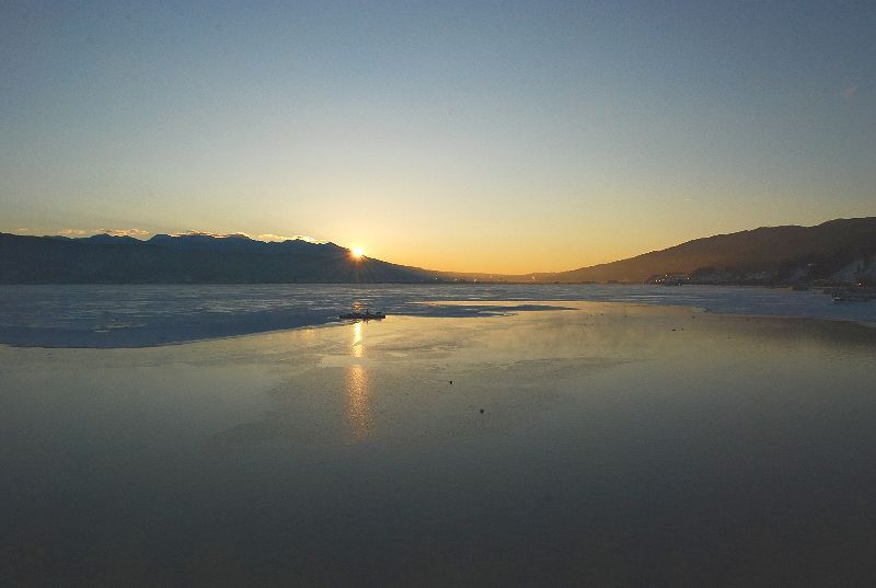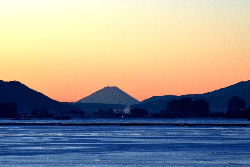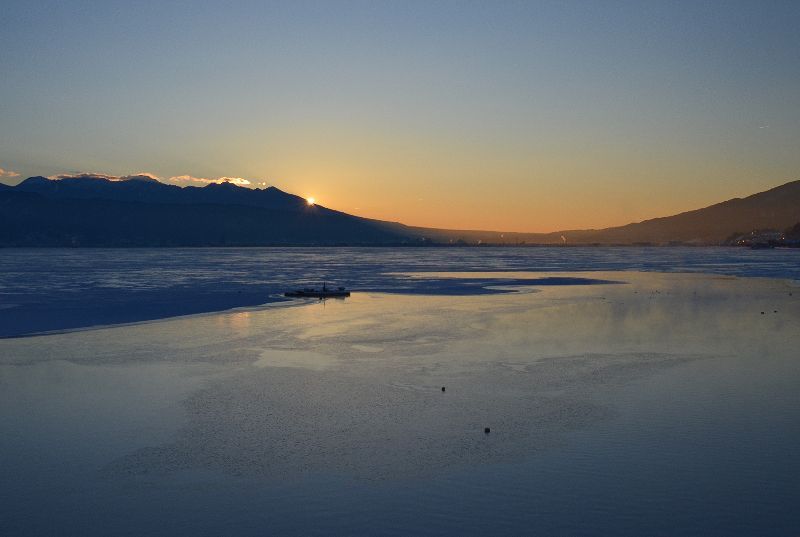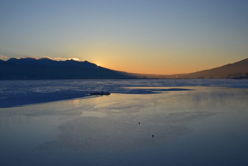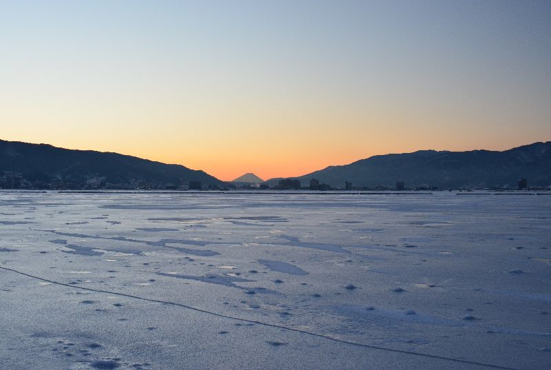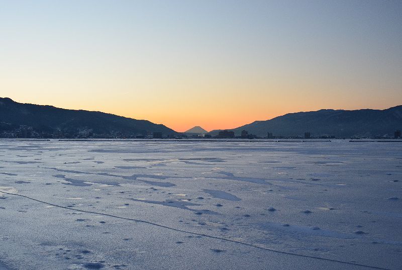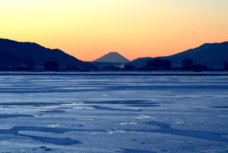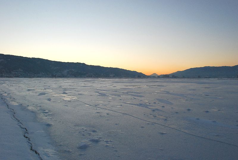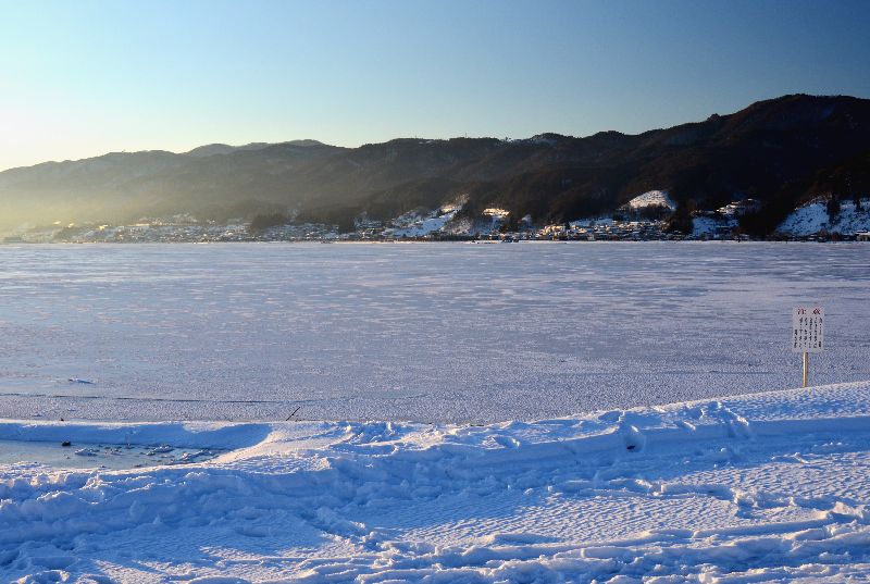 諏訪湖周辺はこの冬一番の寒さ(岡谷市釜口水門で-13℃)。諏訪湖は全面結氷で「御神渡り」の期待が高まっている。