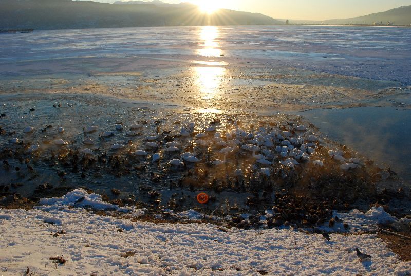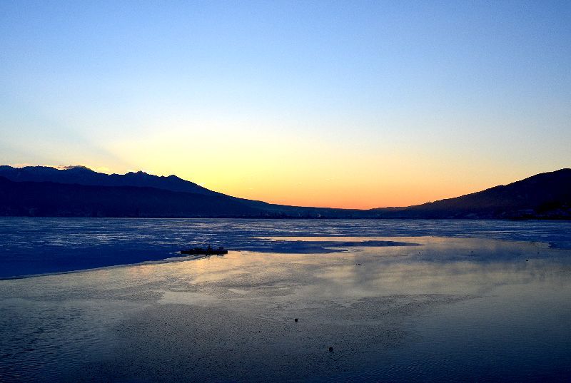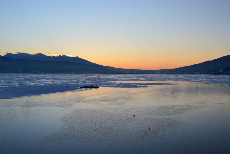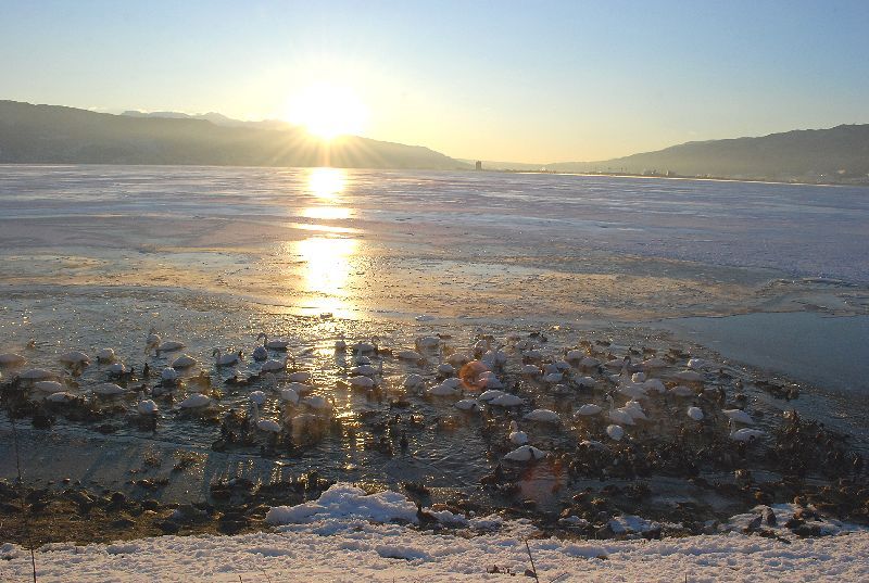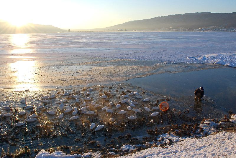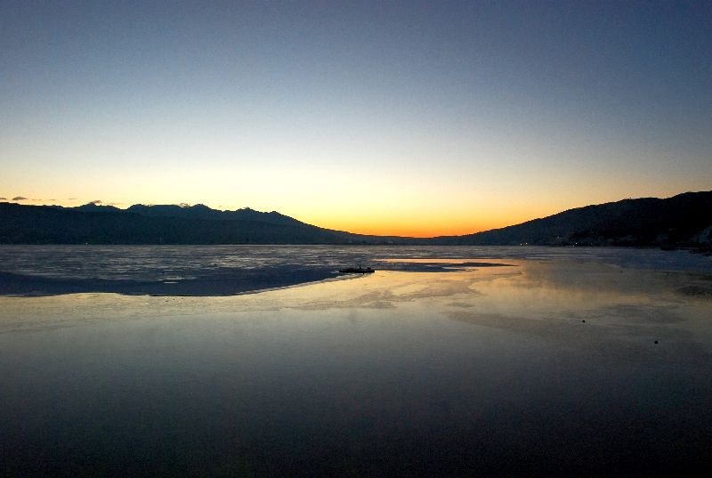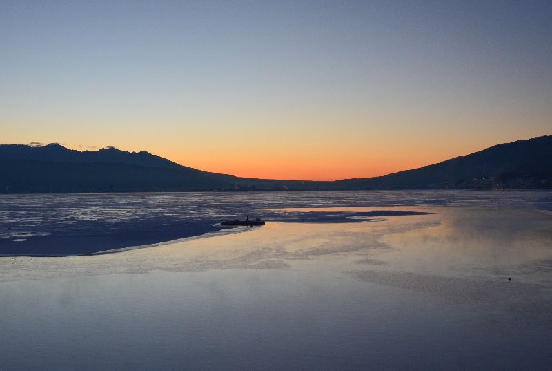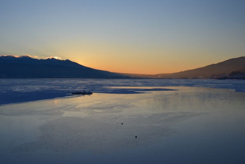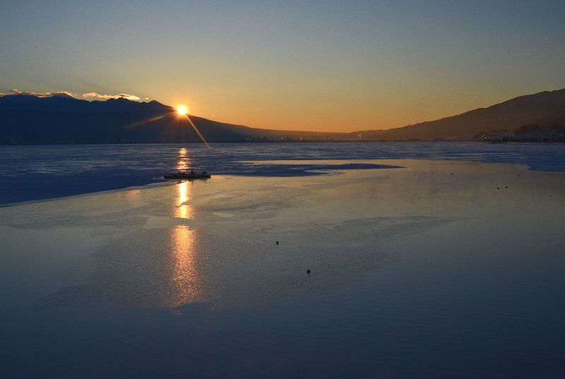 諏訪湖周辺はこの冬一番の寒さ(岡谷市釜口水門で-13℃)。諏訪湖は全面結氷で「御神渡り」の期待が高まっている。