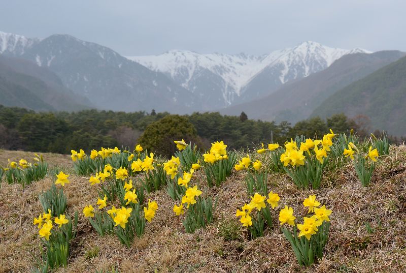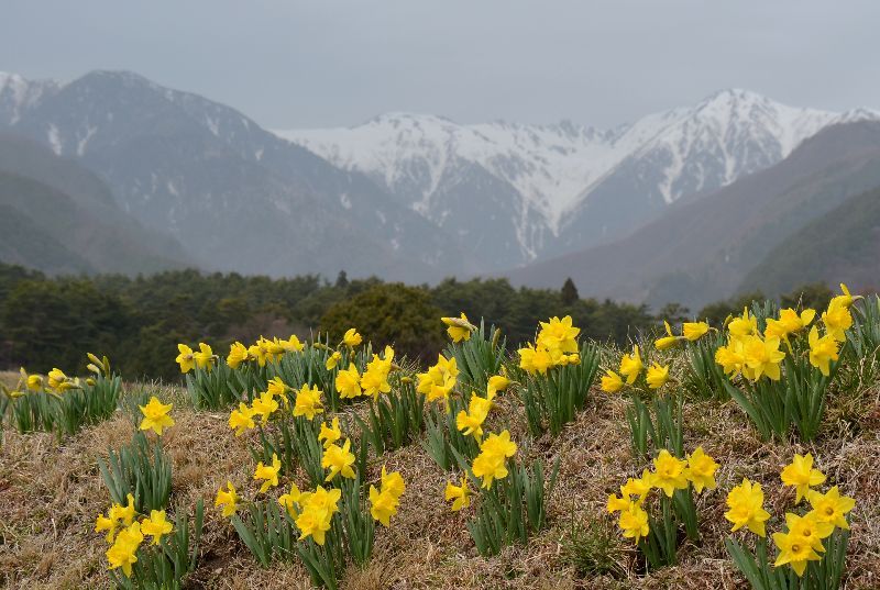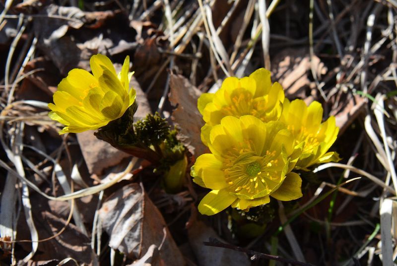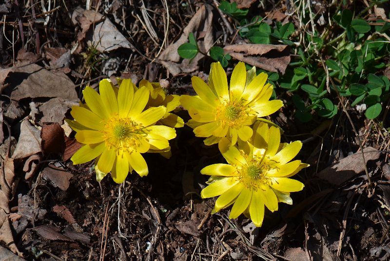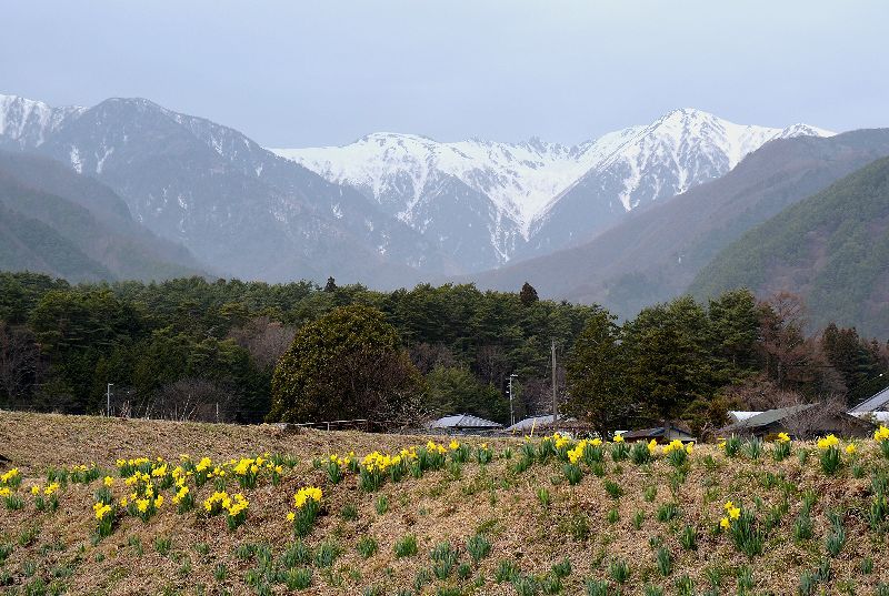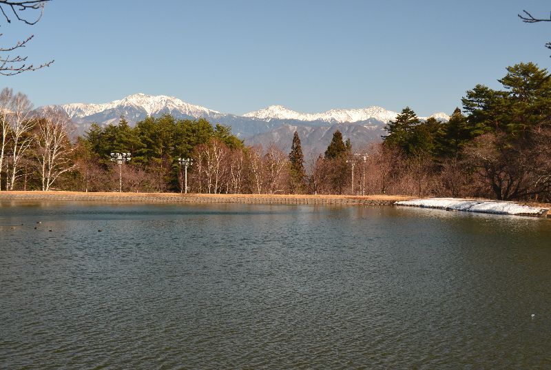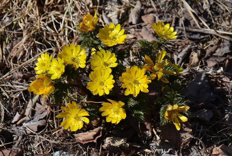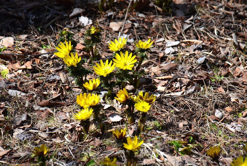 霞も少なくぽかぽか陽気に誘われてちょっと足を展ばして駒ヶ根辺りに寄ってみた。大沼池の土手の福寿草は