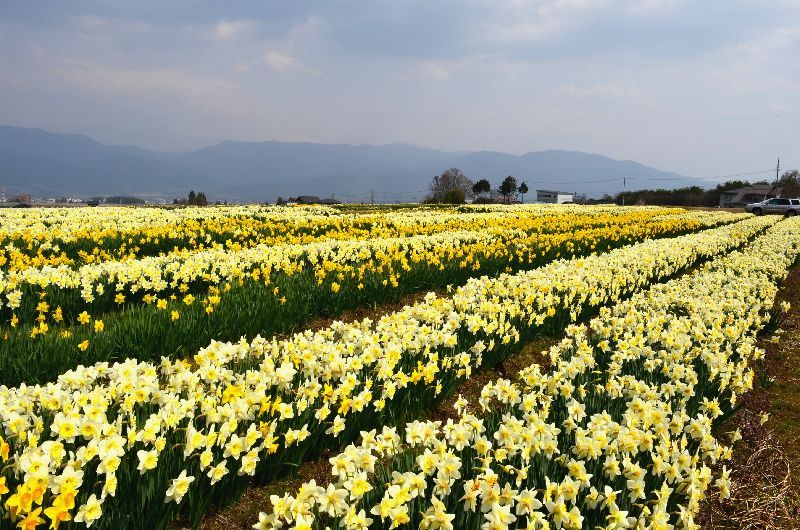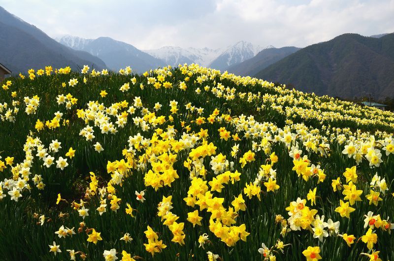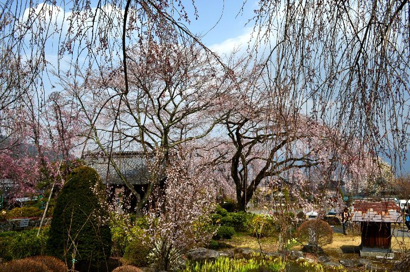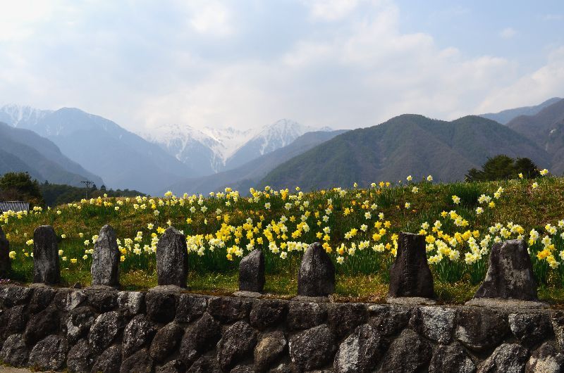 駒ヶ根市光前寺の桜は三分咲き、周辺の水仙は咲き揃った。