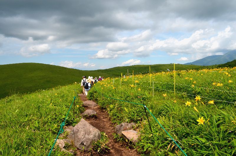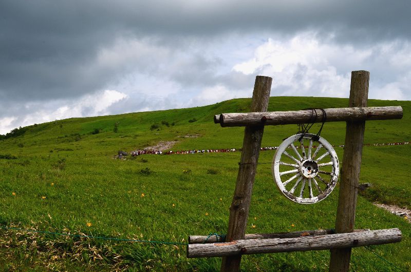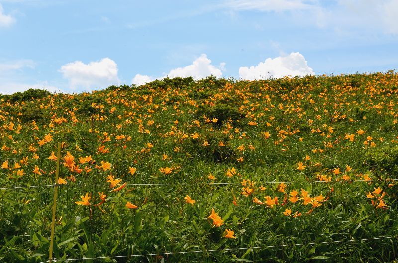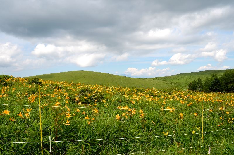 鹿の食害から守る為に電気柵を張り巡らせその囲いの中だけはかつての黄色に染まる景色が見られるが柵の外は