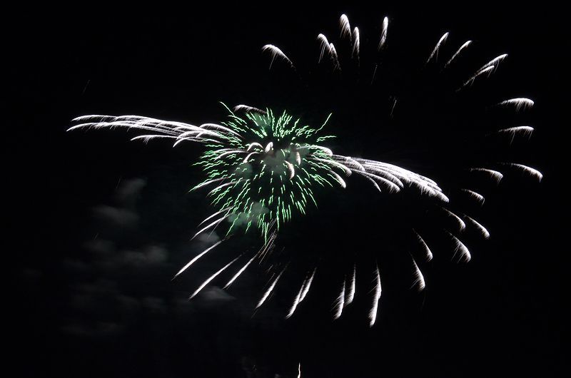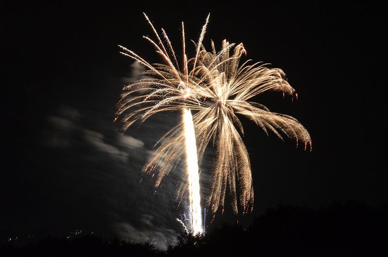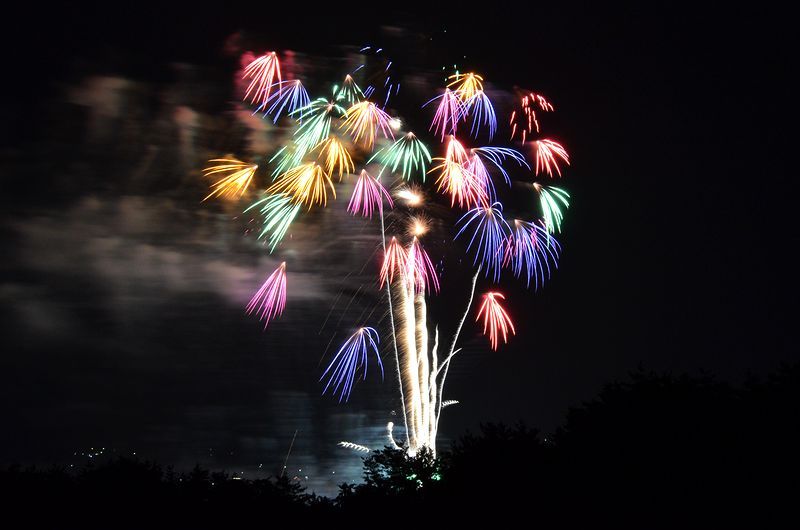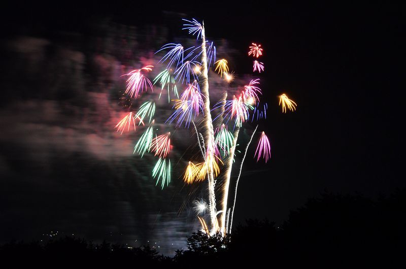 林の中で上げるので8号玉が最大の花火。 昼は暑いのに夜は寒い程だった。
