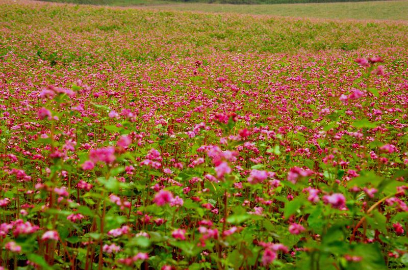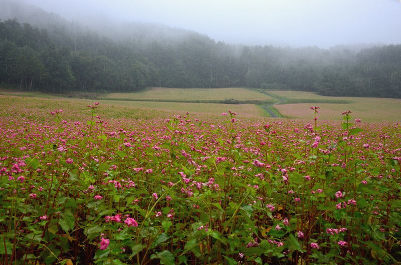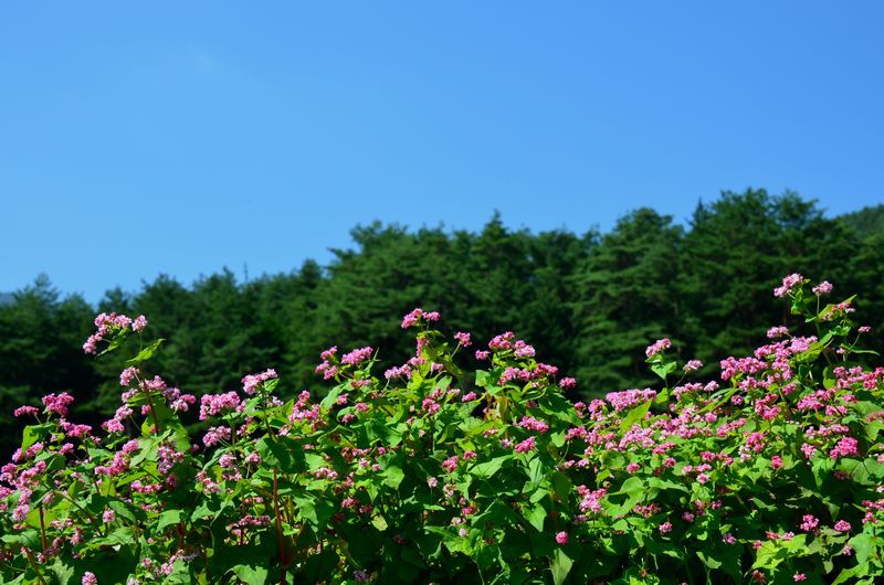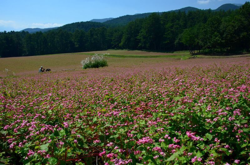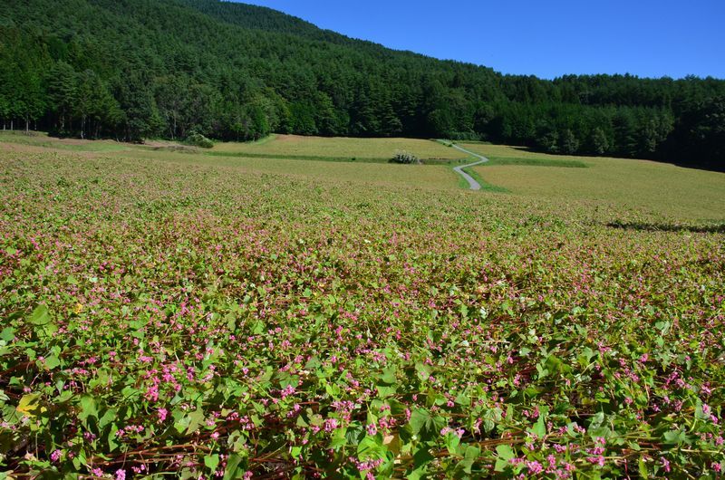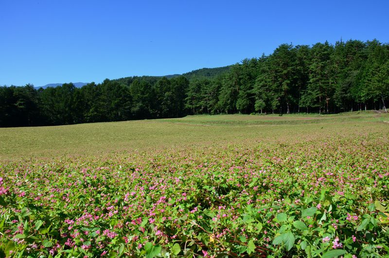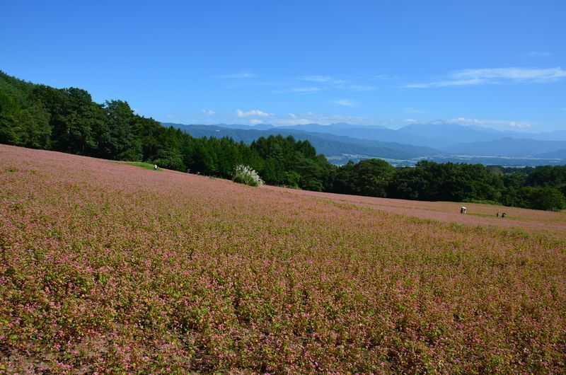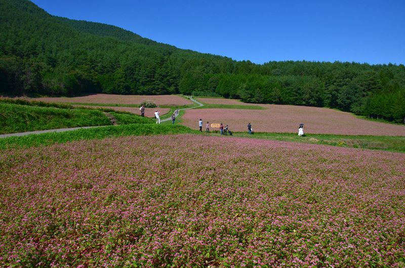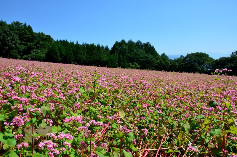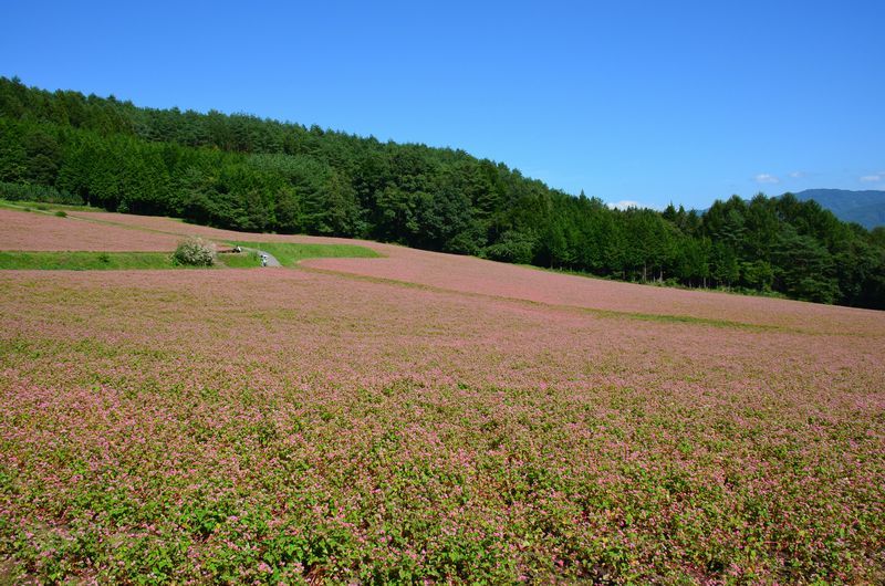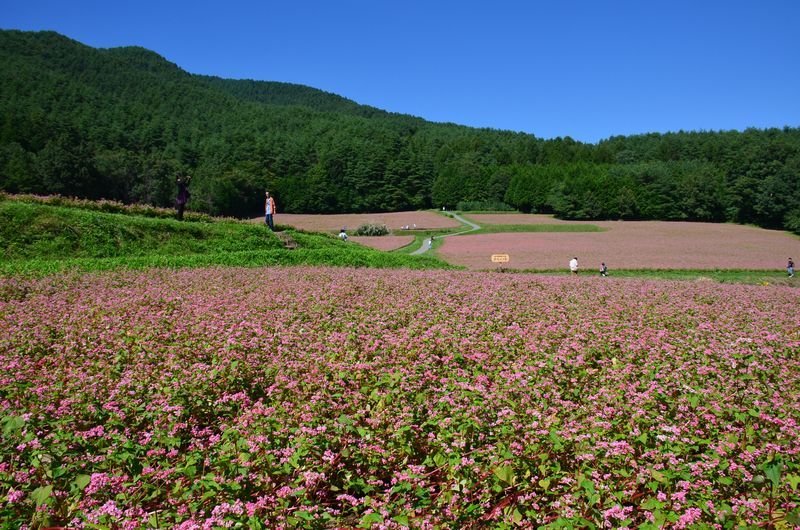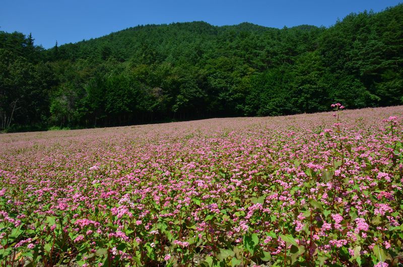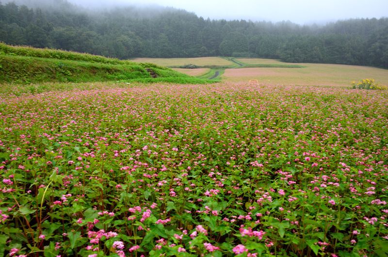 台風の暴風雨で殆ど倒れてしまった。その後の好天気の連続で6割くらい回復し綺麗な赤そばの里になりつつある。