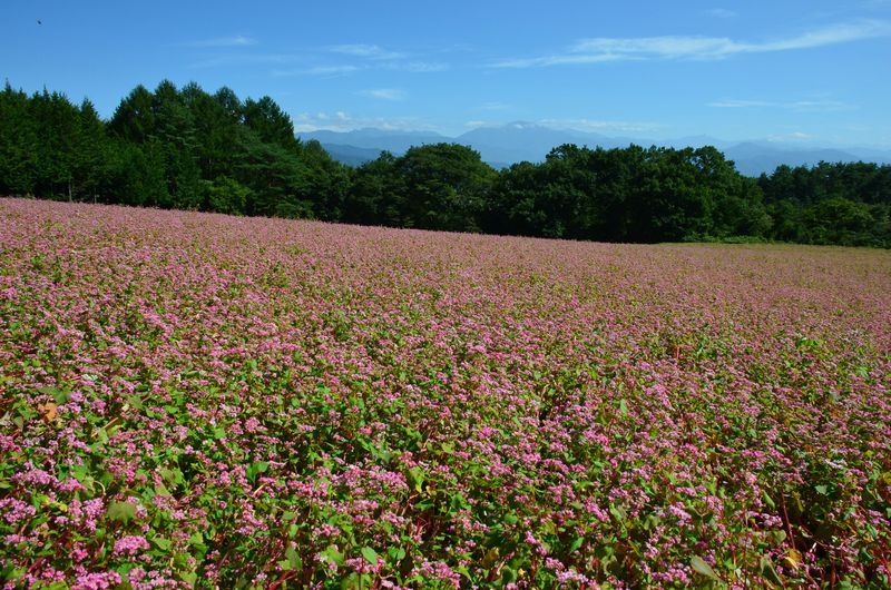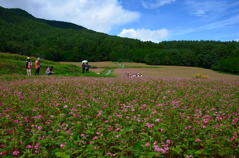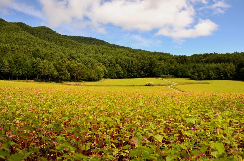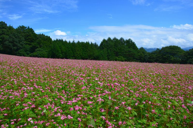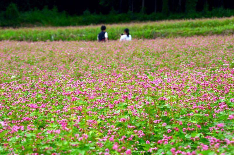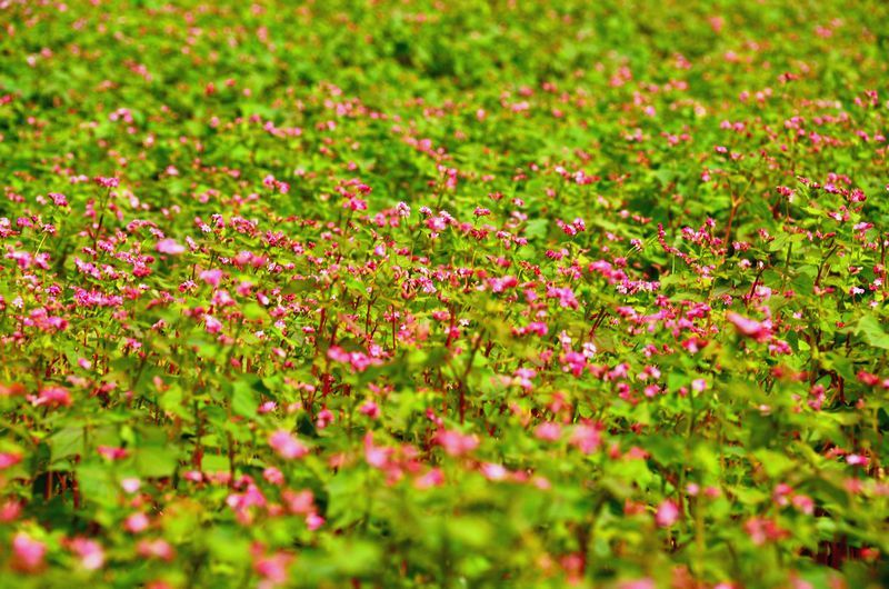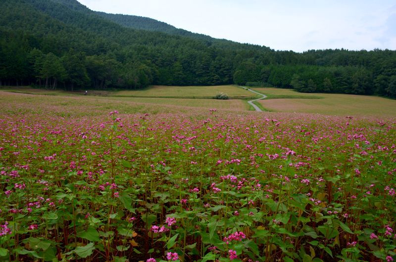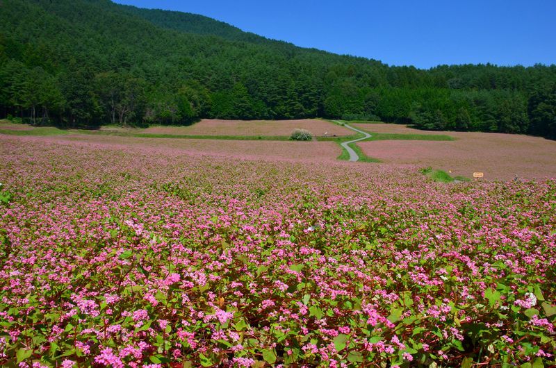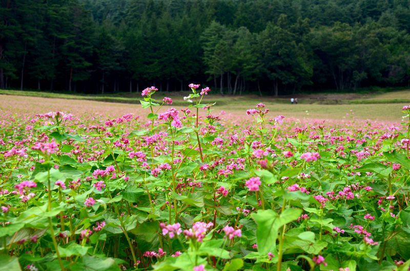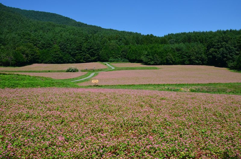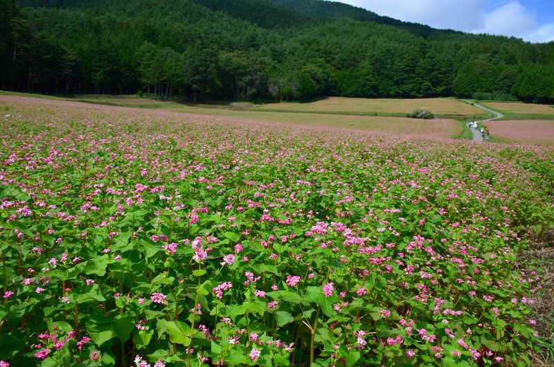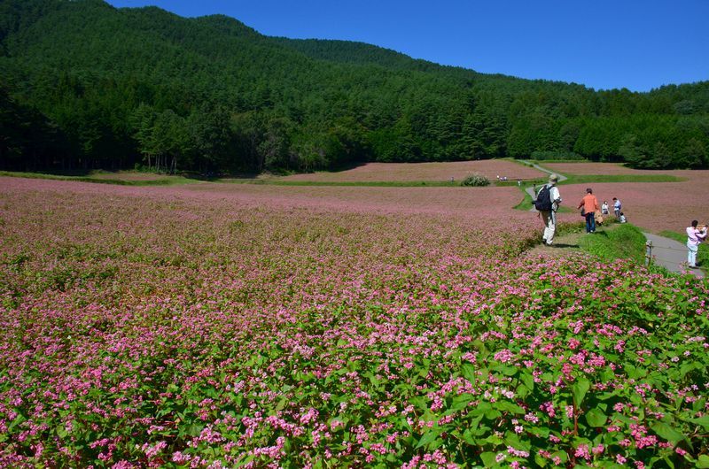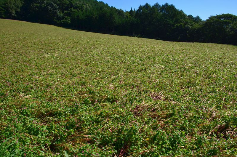 台風の暴風雨で殆ど倒れてしまった。その後の好天気の連続で6割くらい回復し綺麗な赤そばの里になりつつある。