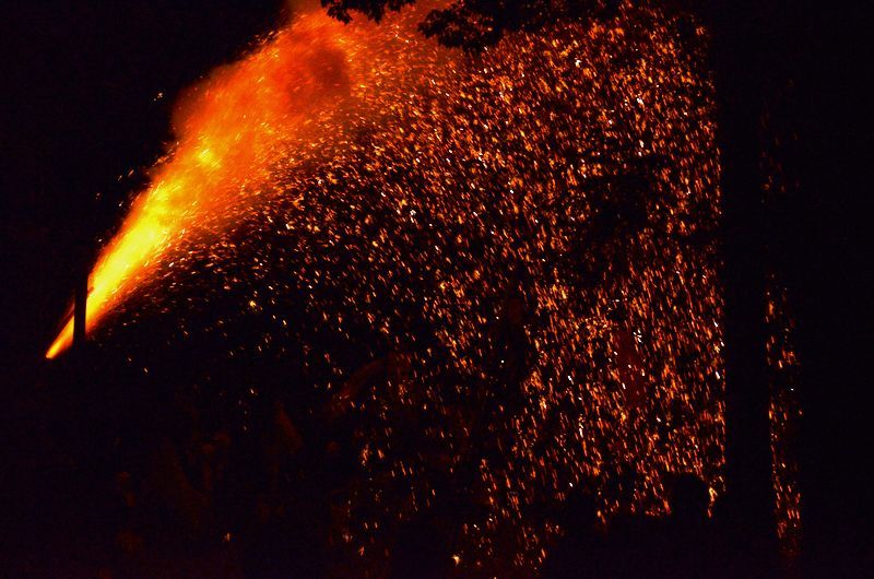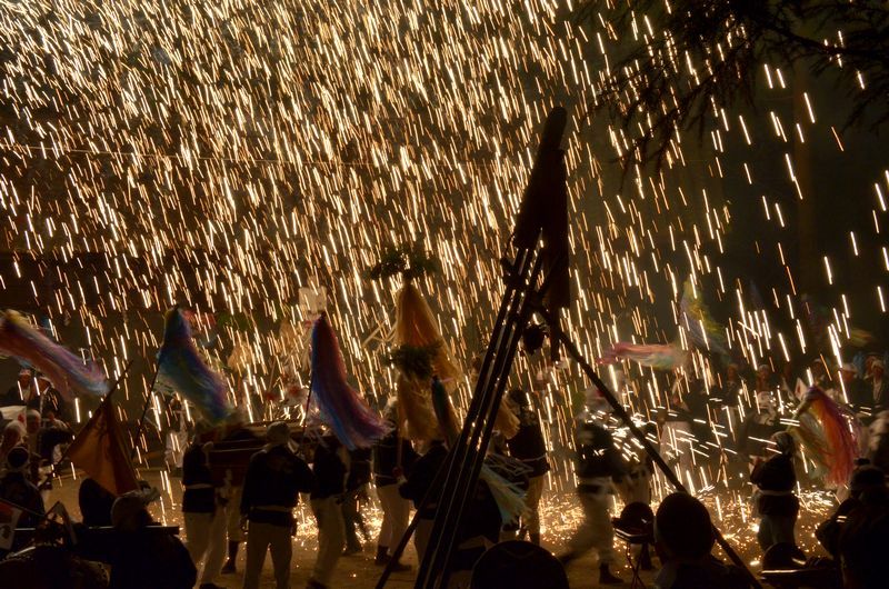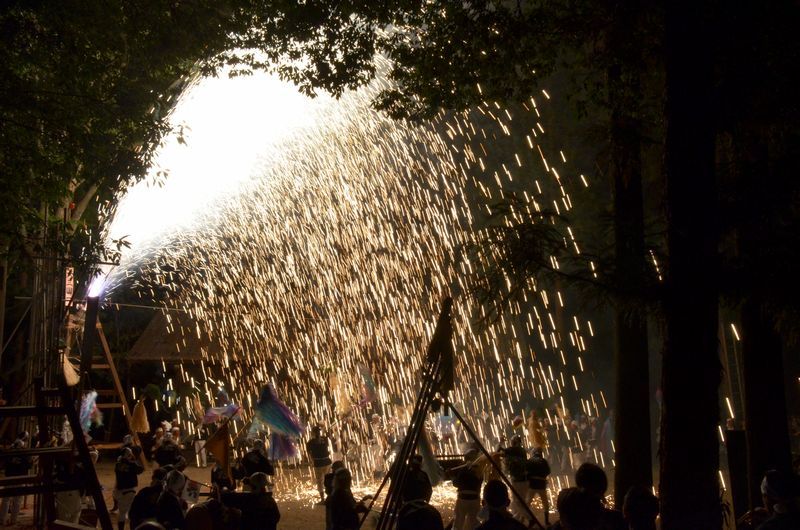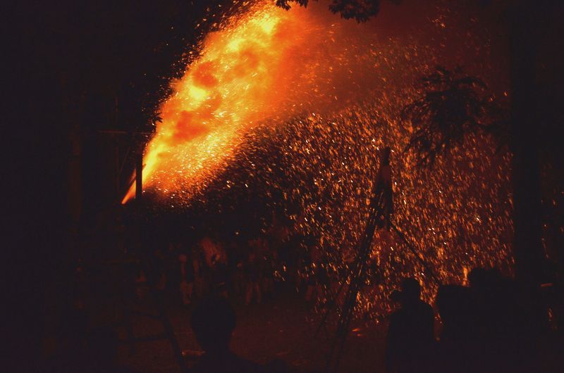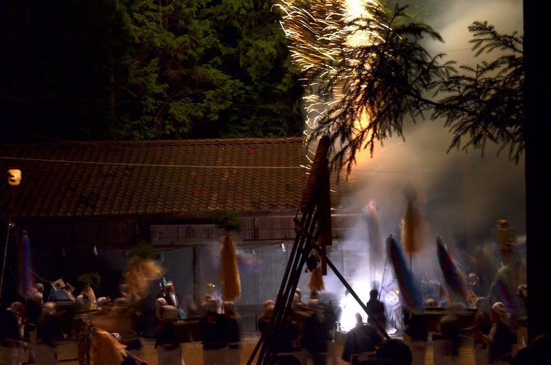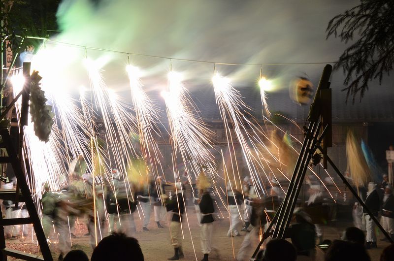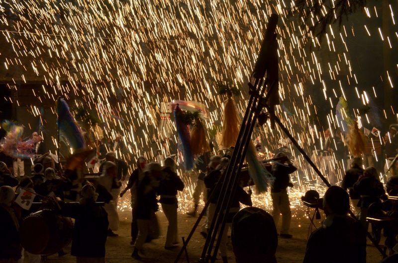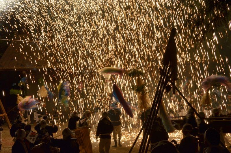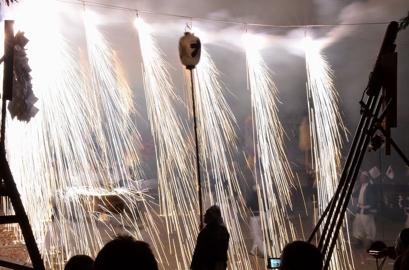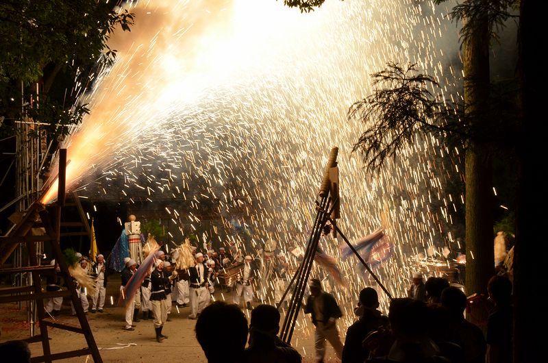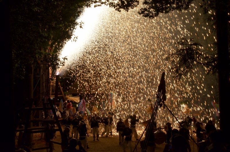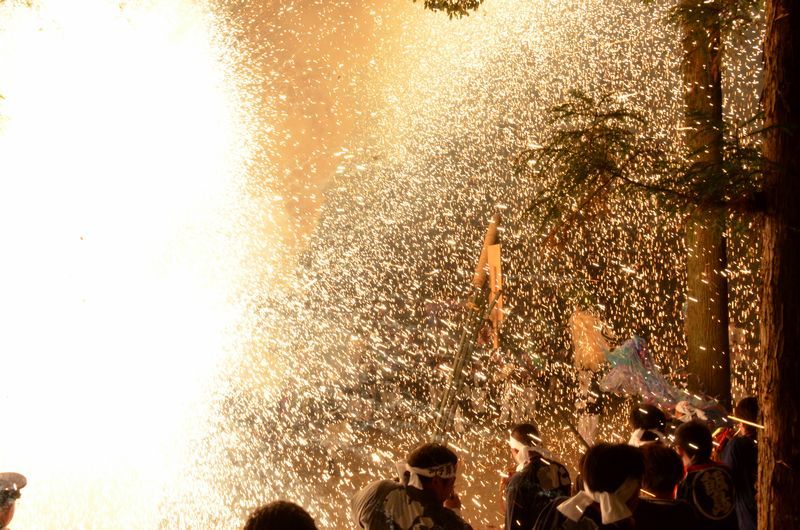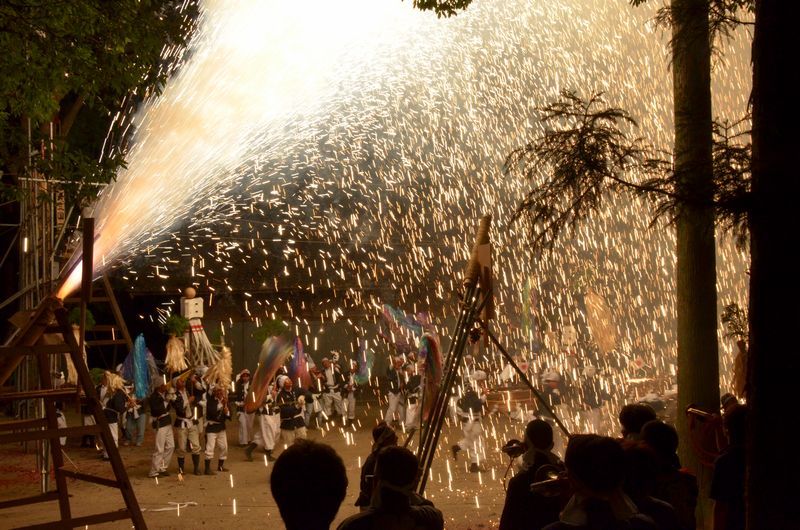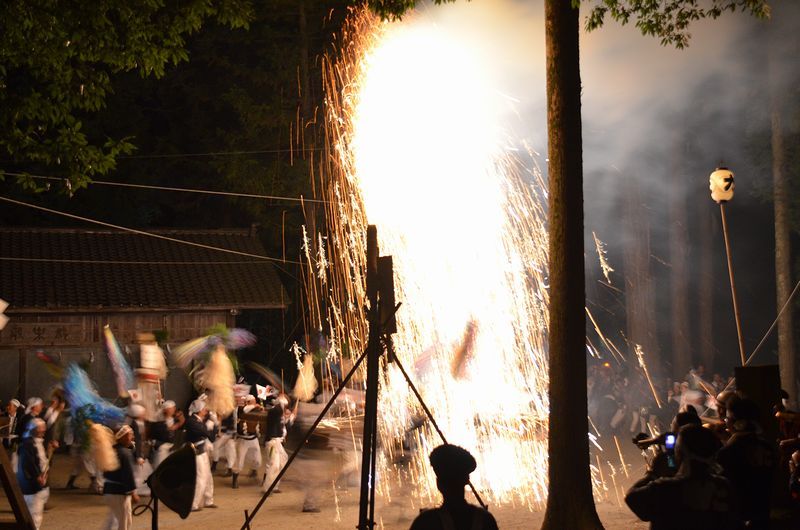 打上げ花火に数十発の尺玉花火があり境内での仕掛け花火、火の粉が観客席に飛んでくる三国花火が見もの。
