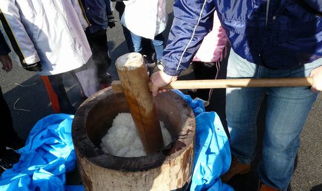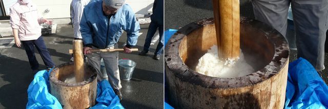 蒸かしたもち米を臼に入れて杵で丁寧につぶす^。 これが大事