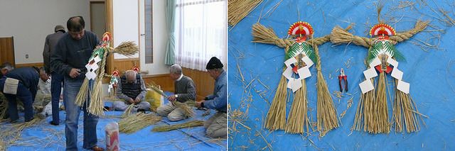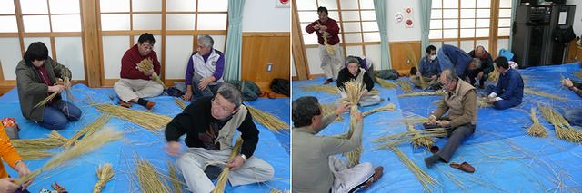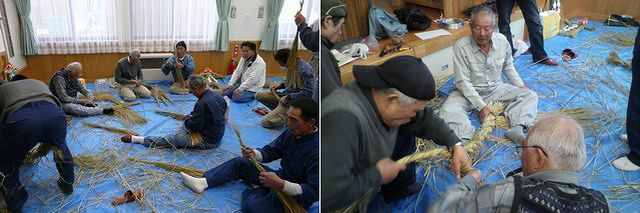 横の太い注連縄は皆出来た様でそれに垂らす三本の注連縄を編む