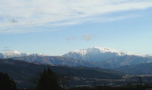 注連縄作りを終えて公民館を出ると南アルプス甲斐駒ヶ岳、仙丈ヶ岳に夕日が射していた。 寒い!
