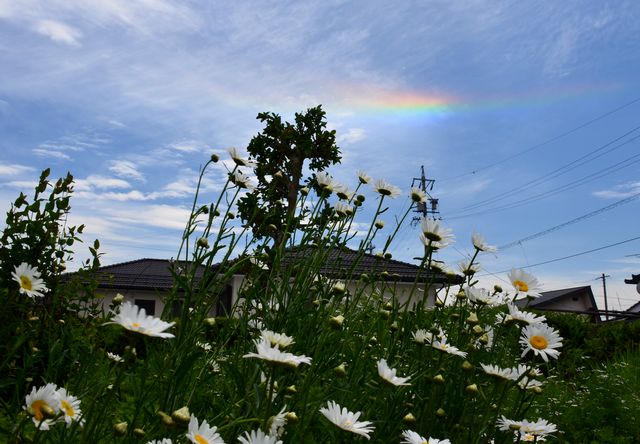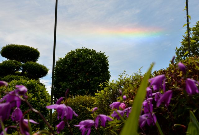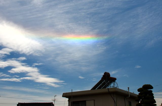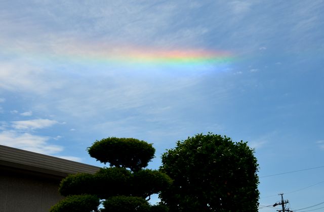 実家の庭でふと空を見上げたら虹の様な色の雲で、最初は彩雲かと思ったが・・・。5/22 12:52撮影