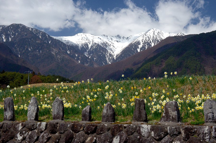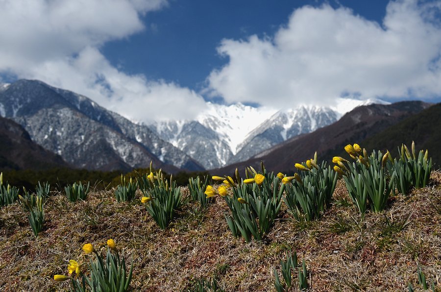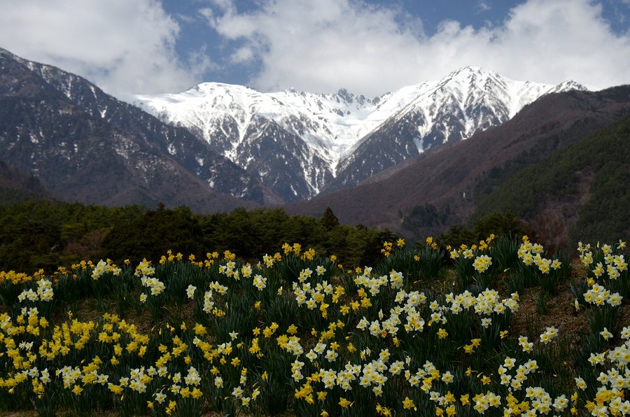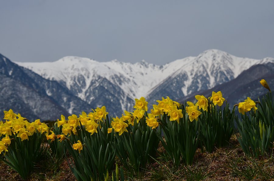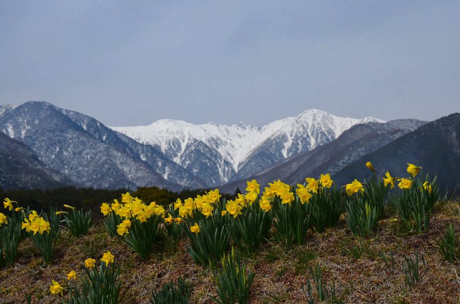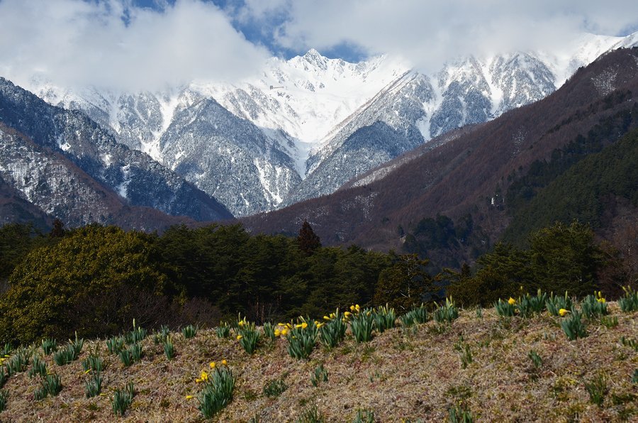南/中央アルプと水仙 撮影 2016.3.11,23/4.14