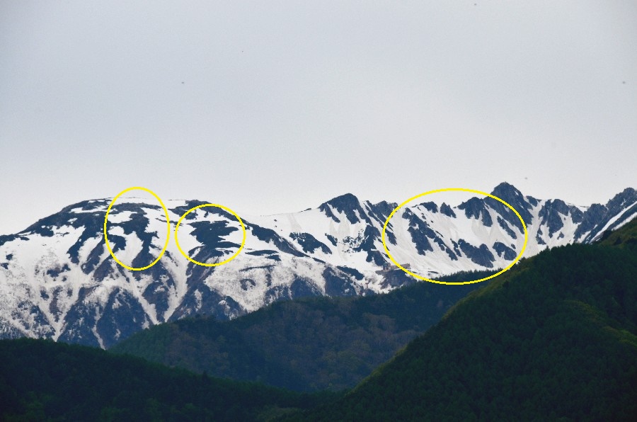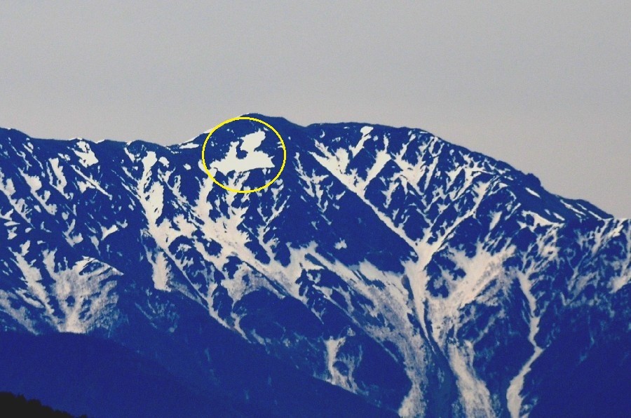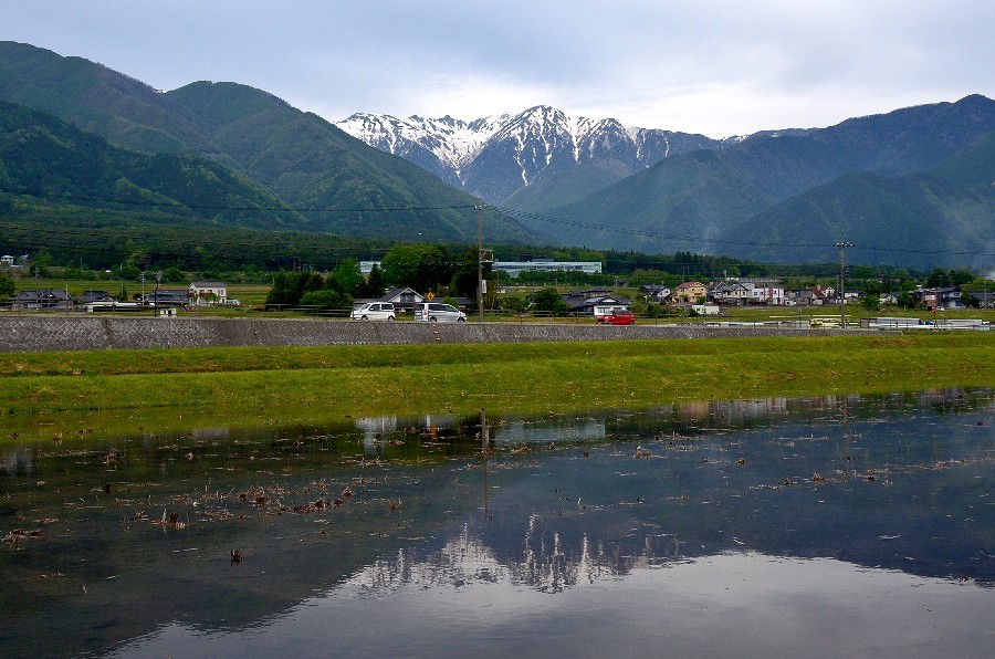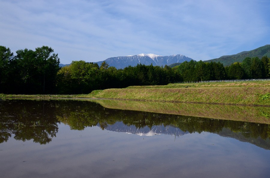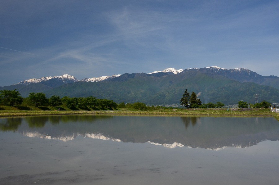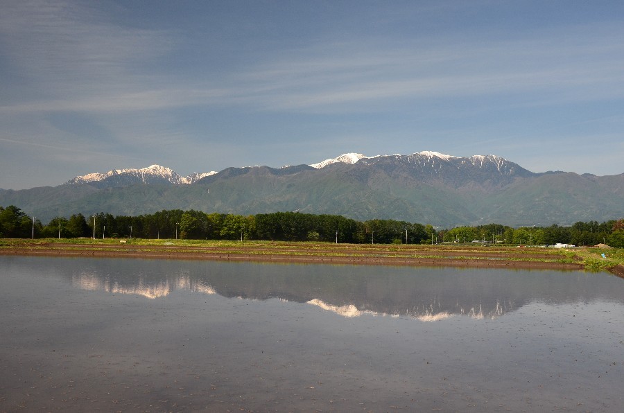 田んぼの水鏡に映る中央/南アルプス、雪形 撮影 2018.5.8〜12