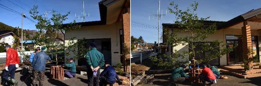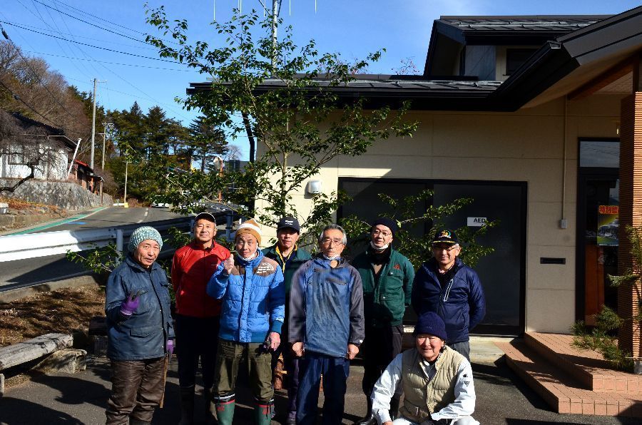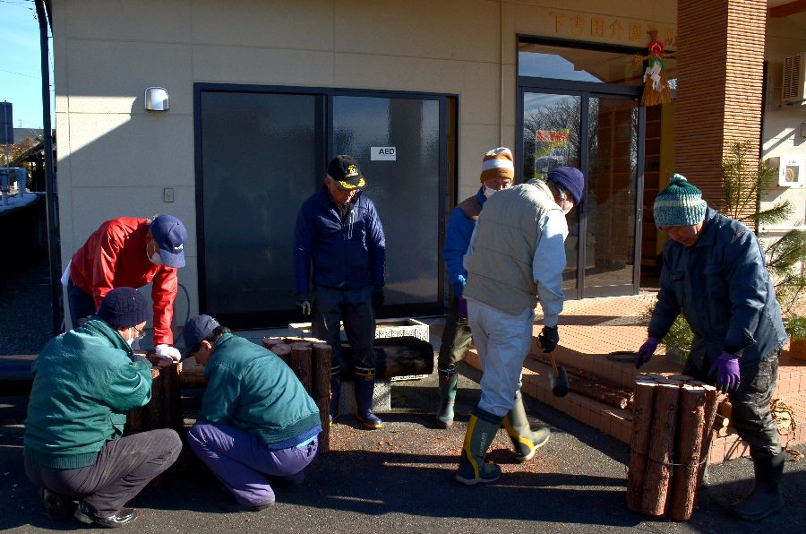 有志が8人集まってほんだれ様作り開始。幾つもの作業があるので手分けして・・・ 公民館駐車場