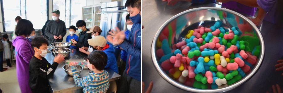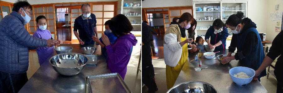 繭玉作りは公民館役員が中心になって米粉を煉って湯がいて食紅で色付けして作成(赤、青、緑、黄と白の5色の繭玉)。