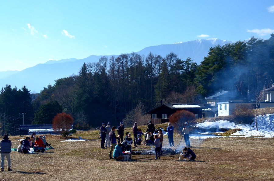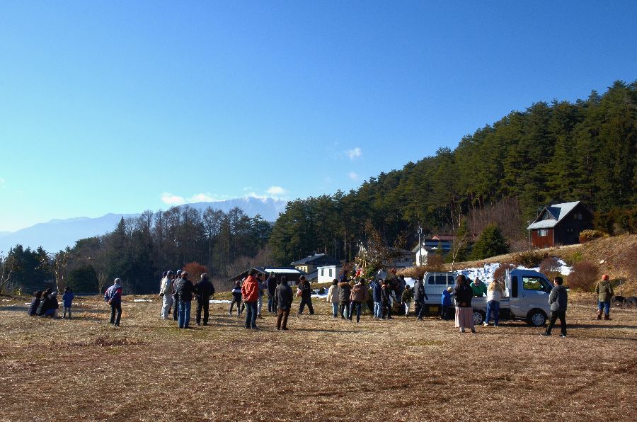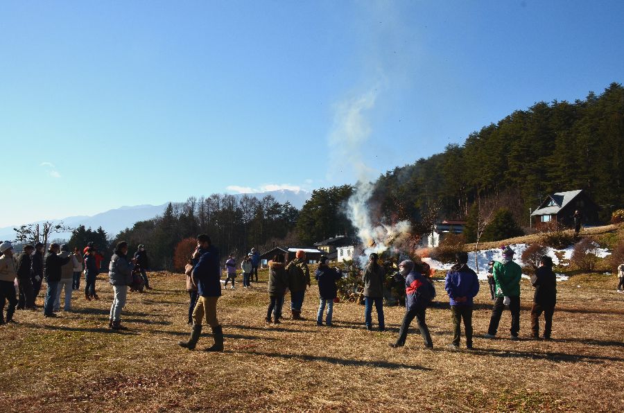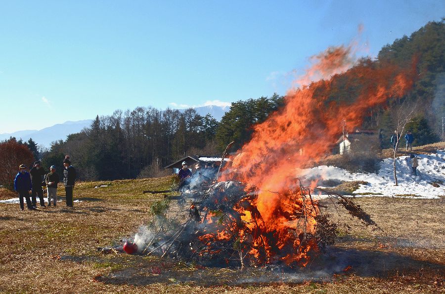 運動場でどんど焼き。 しめ縄等は公民館役員/子供会親子が区内の各家から集めた。 <遠方は中央アルプス将棋頭山>