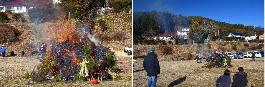 どんど焼き。 風の無い日和で良かった!(1週間前の予報では南岸低気圧接近と寒波で前日の夜から雪降りだった!)