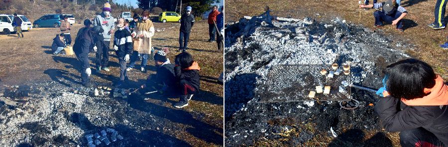 どんど焼きの熾きで餅焼き。 火力が強いので直ぐ焼ける
